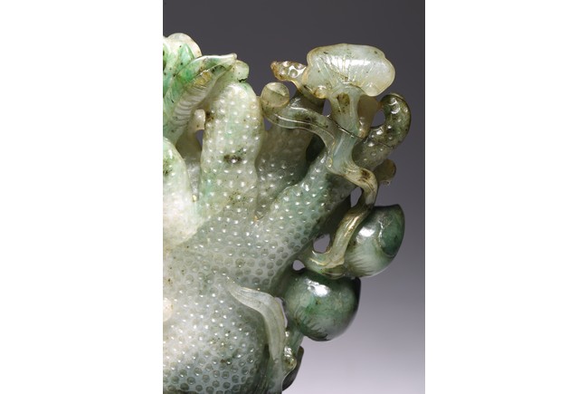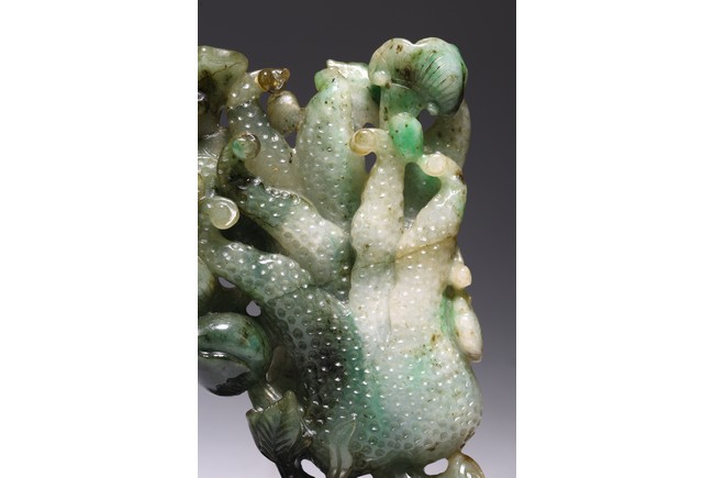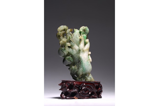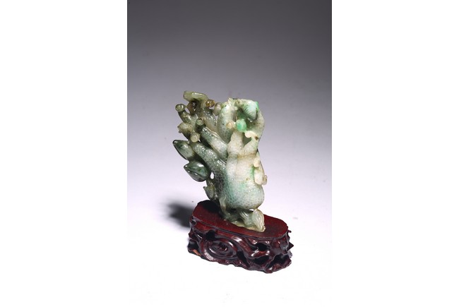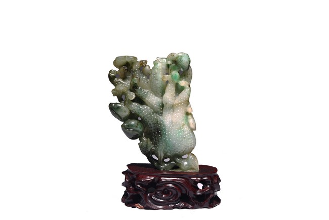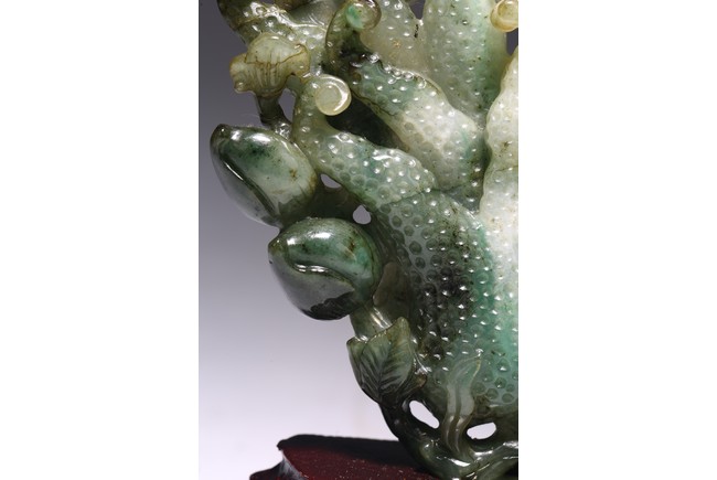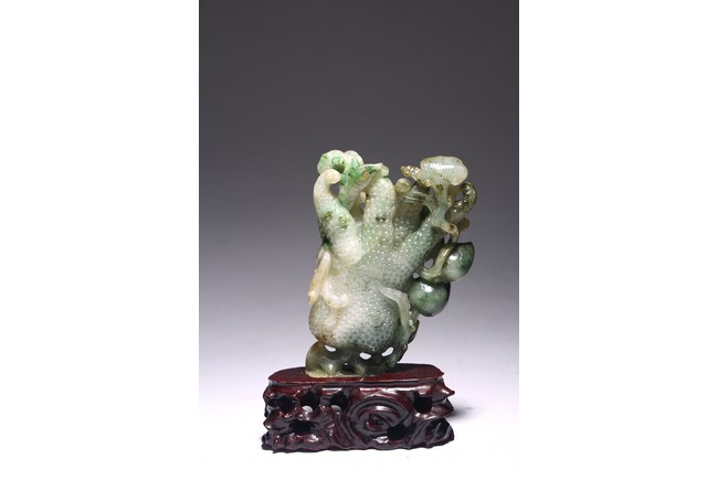 Modelled in the form of finger citron, the stone is of translucent mottled dark green to pale green and white tone. Wood stand. Accompanied with certificate that confirming the jadeite as Type A. Republic period.