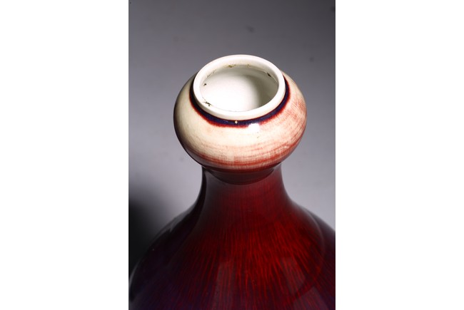 Each vase is suffused with attractive deep red glaze with streaked lavender and blue glaze. The base inscribed with marks. 20th century.