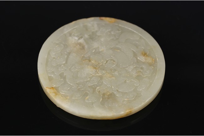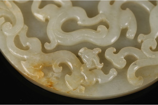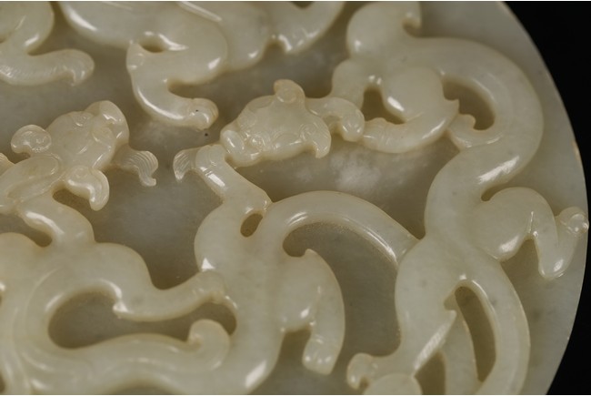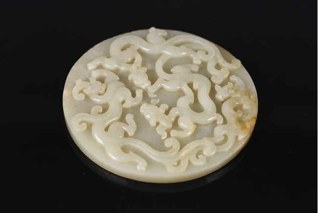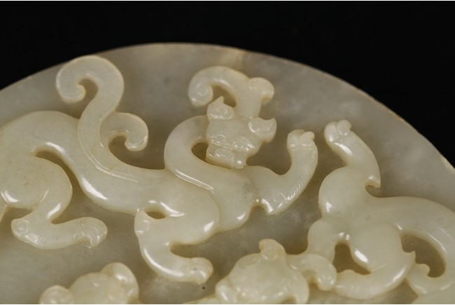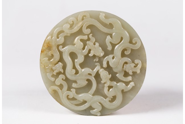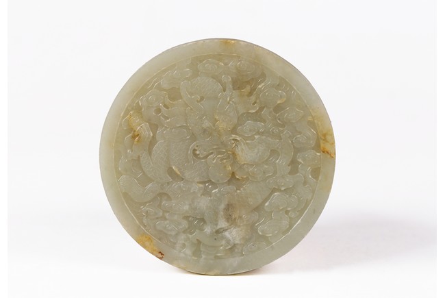Of circular form, the bi carved with sinuous chi-long dragons in high relief to the front, the back carved in shallow relief with a large four clawed dragon emerging from clouds.