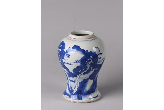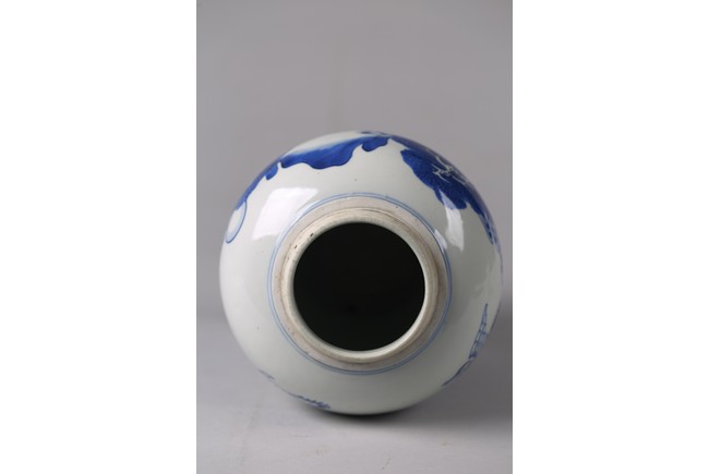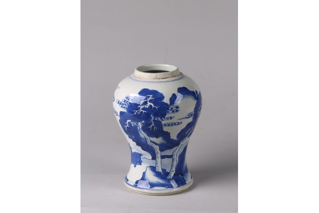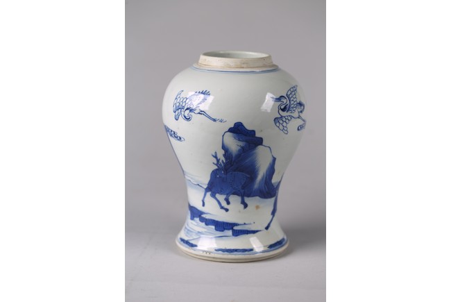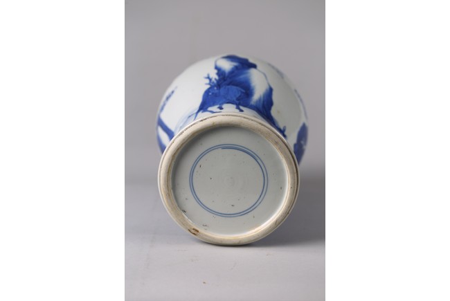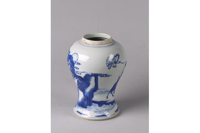 The baluster body painted with deer and cranes in a river landscape with pine trees and mountains, the base with double ring. Qing Dynasty period.