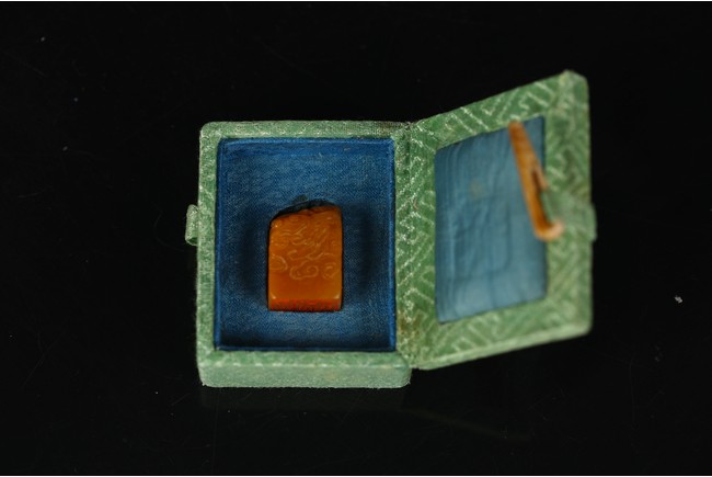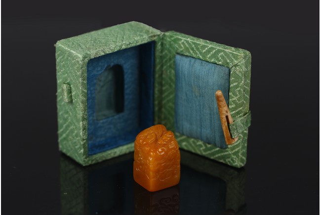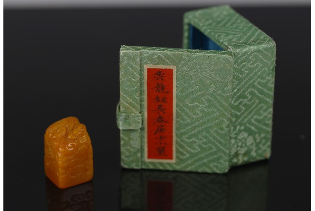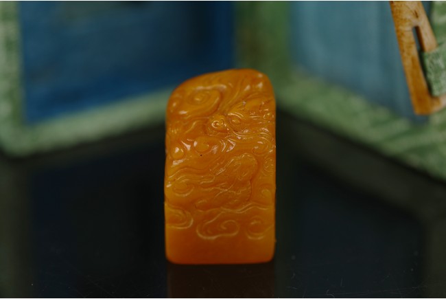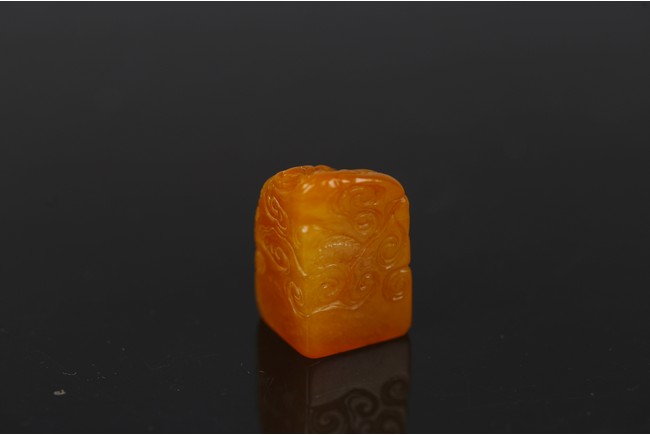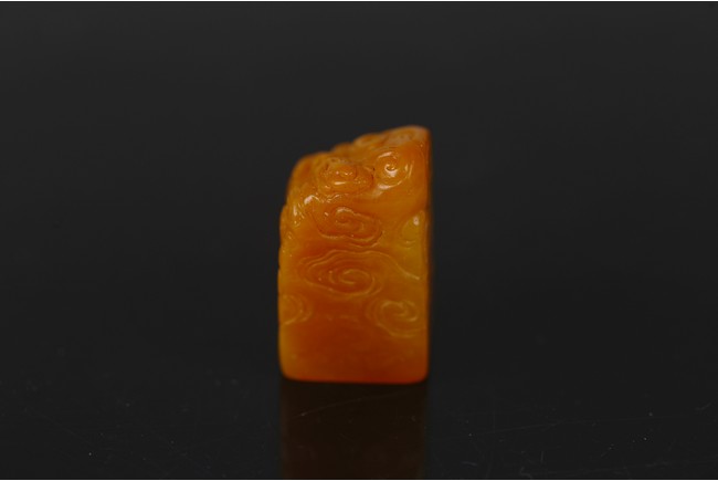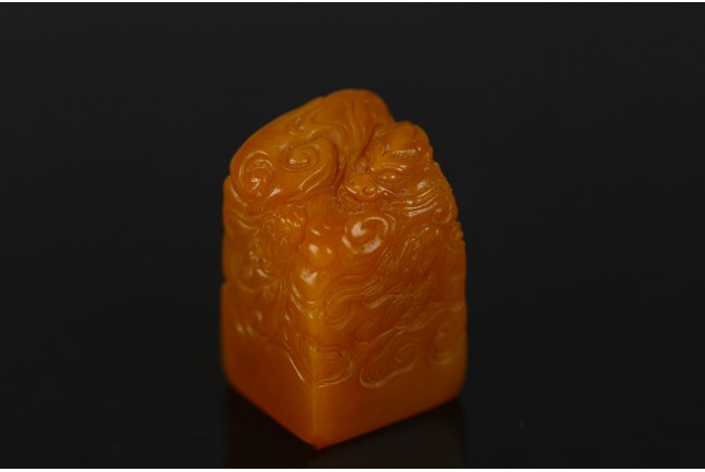 Of square base section, the upper surface and four sides are carved in relief with dragon writhing amid clouds, the seal face carved with four characters. Qing Dynasty period.