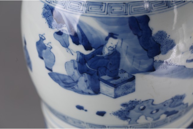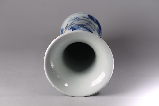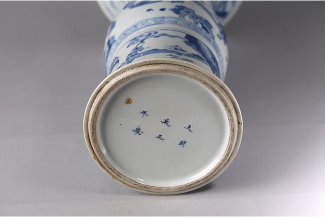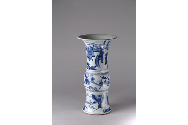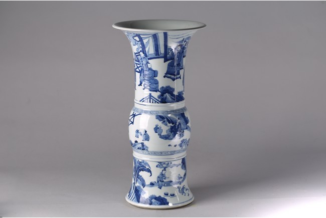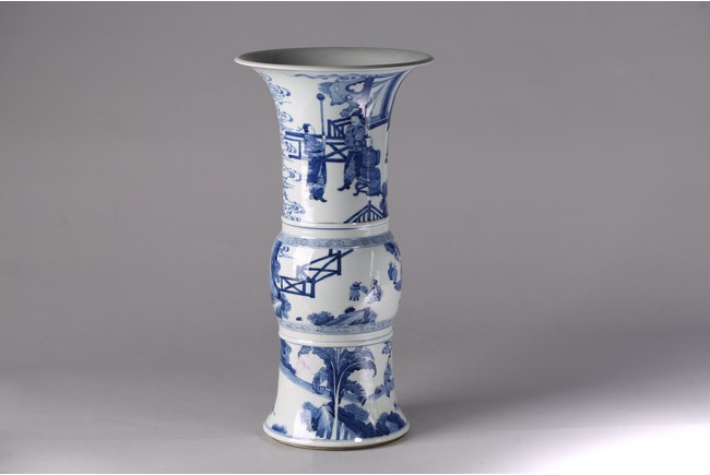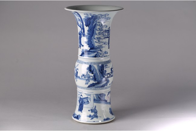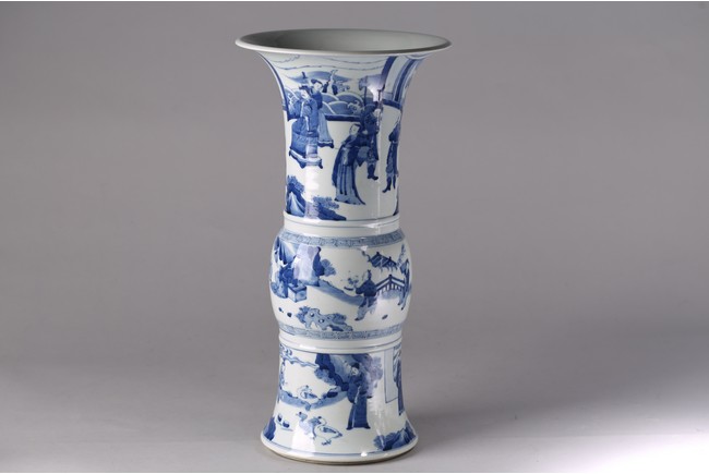Of archaistic 'Gu' form, finely painted around the body with various continuous figural scenes including children at play, a dignitary and attendants in a courtyard, and gentlemen in a garden engaged in scholarly pursuits, the base inscribed with a Kangxi reign mark. Qing Dynasty period.