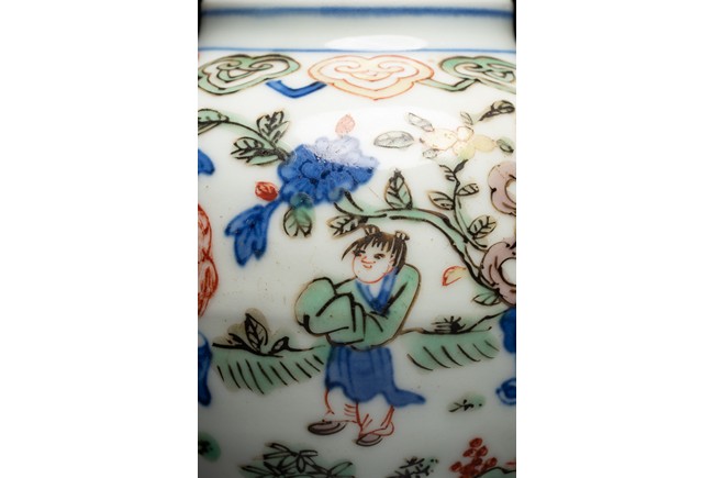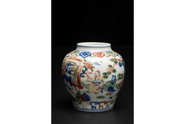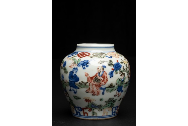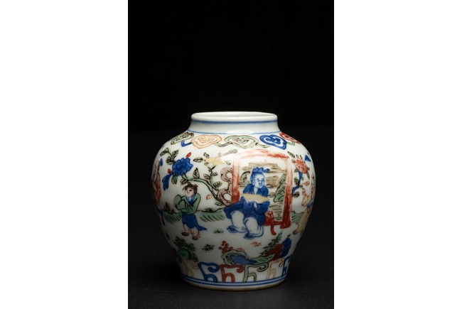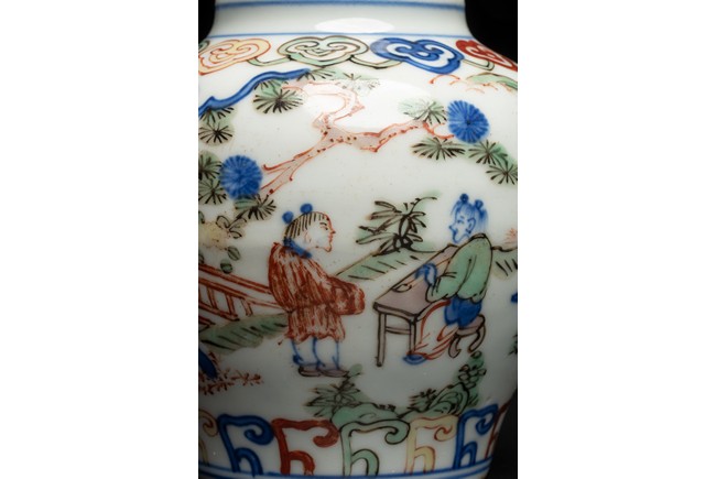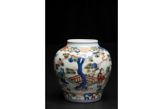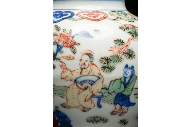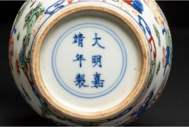 Well painted and enamelled with scene of high ranking official figure accompanied with attendants in a garden, the base inscribed with Jiajing reign mark. Ming Dynasty period.
