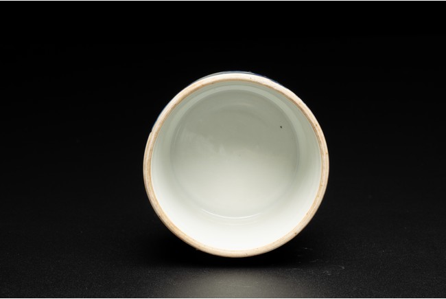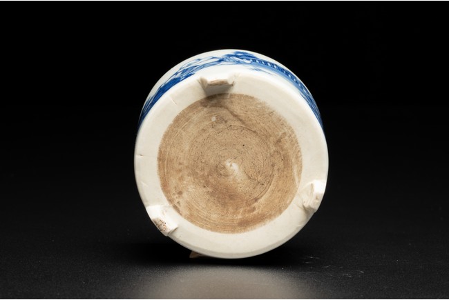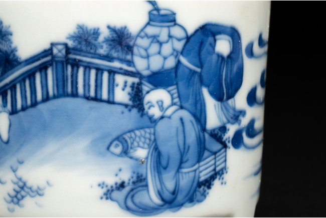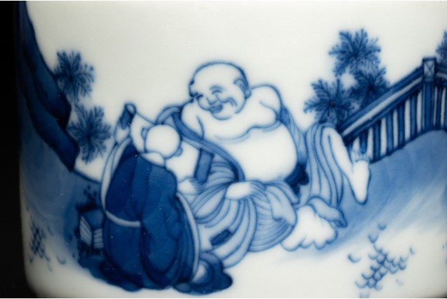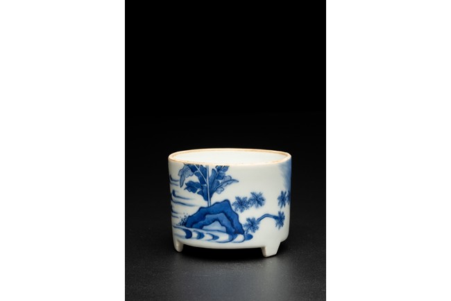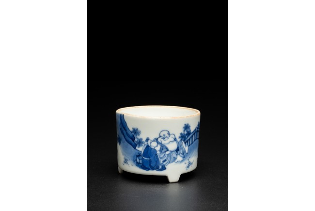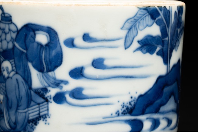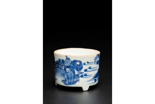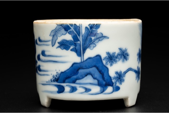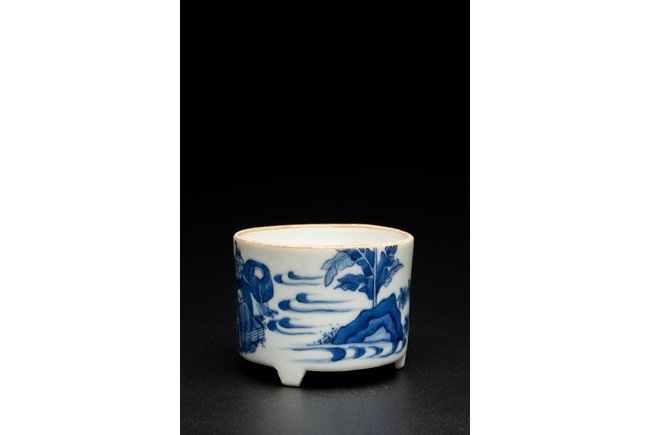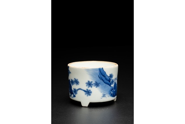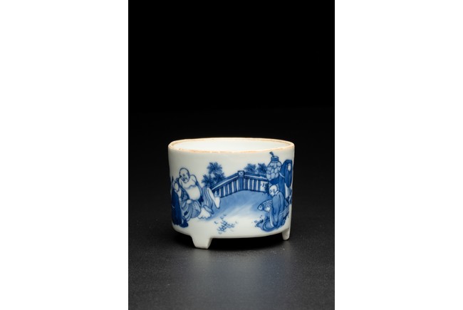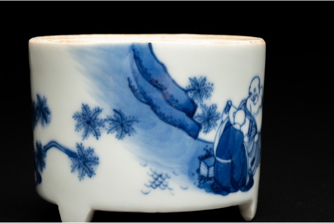 The censer painted in cobalt blue around the body with scene of arhats seated in a outdoor garden landscape.