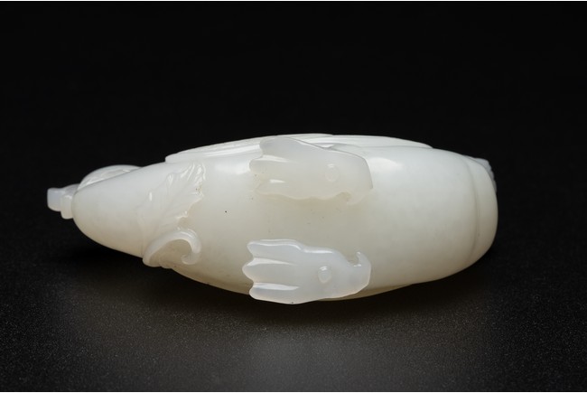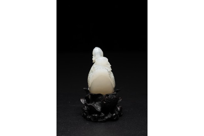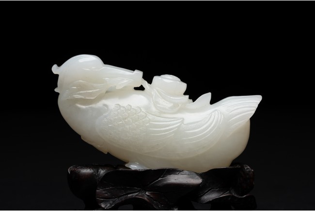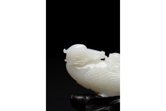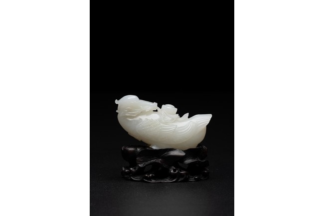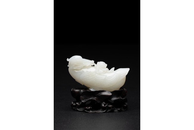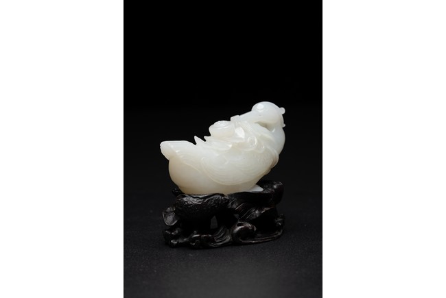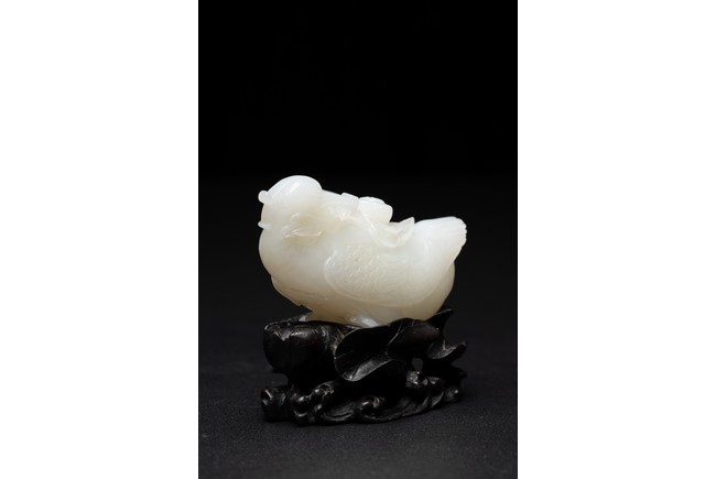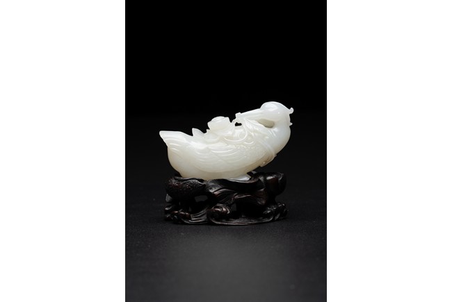 Carved in the form of a duck with its head turned back and webbed feet tucked underneath the body, a sprig of lotus grasped in its beak, the stone is of smooth even white tone, hardwood stand. Qing Dynasty period.
