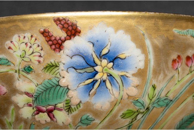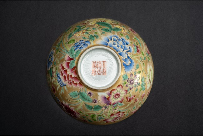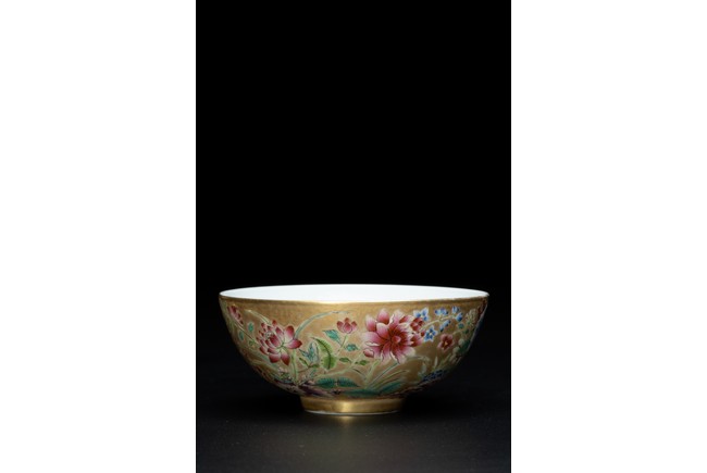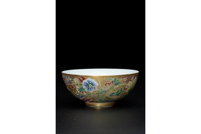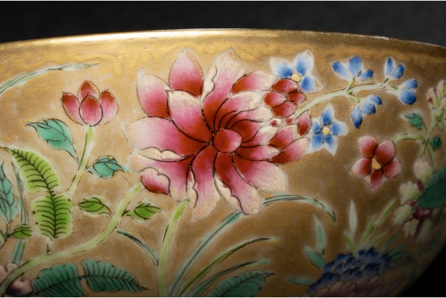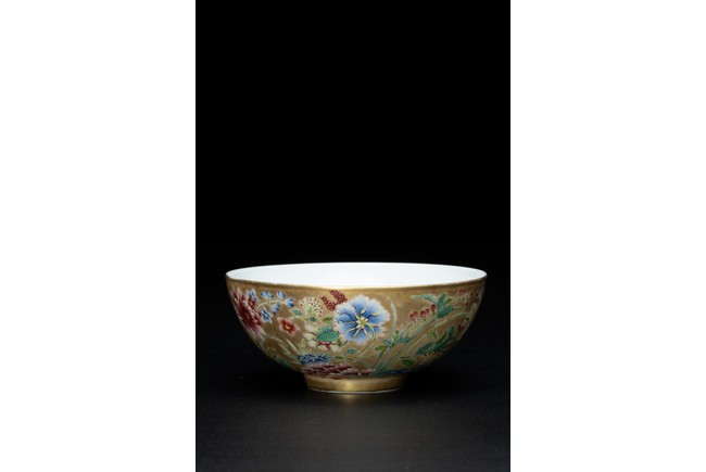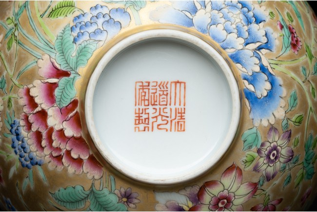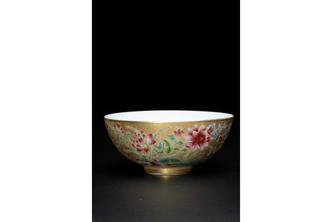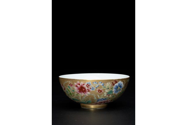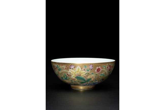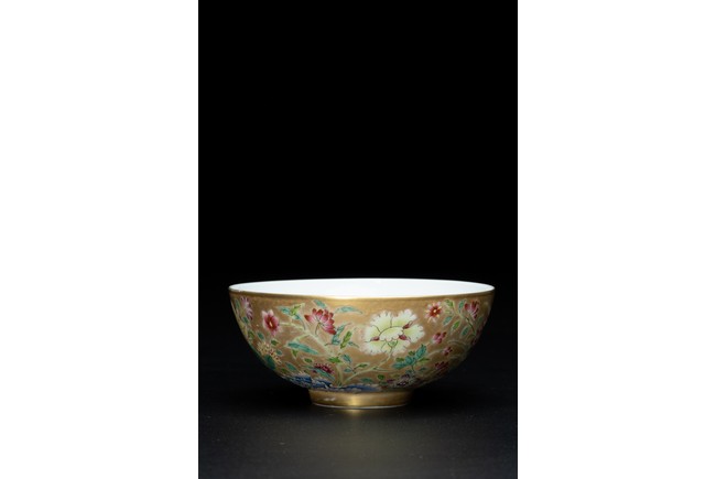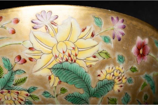 Decorated to the exterior in bright enamels with pattern of floral sprays against a gilt ground. The base bears a Daoguang reign mark.