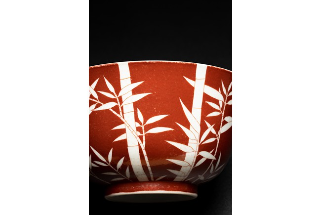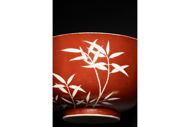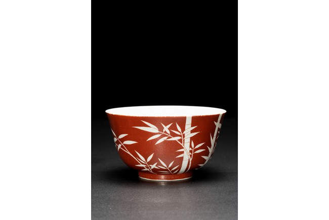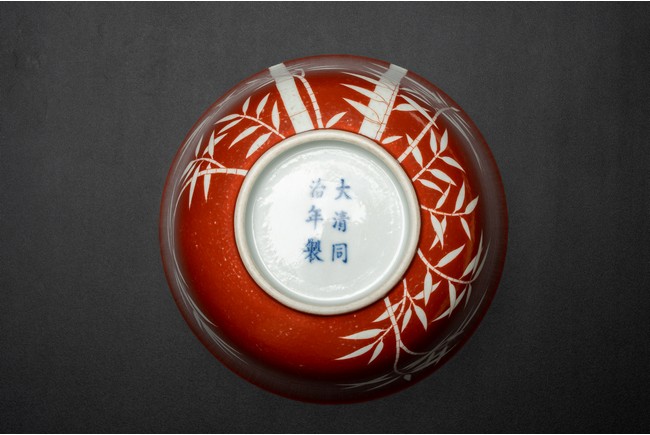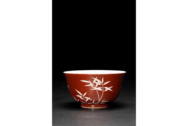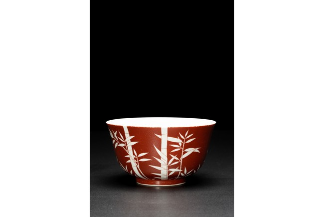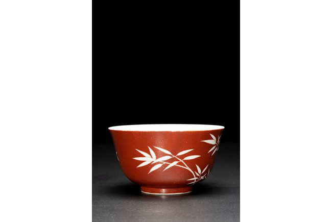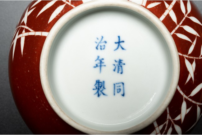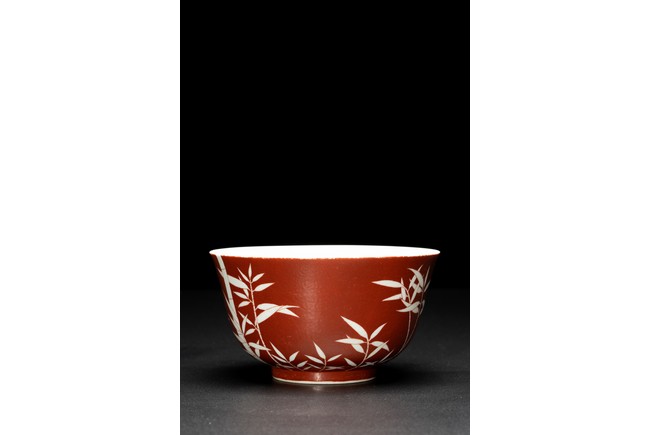 The body covered in brilliant coral-red enamel decorated in reserve through to the glazed white body with boldly executed bamboo shoots, the base inscribed with six character reign mark. Qing Dynasty period.