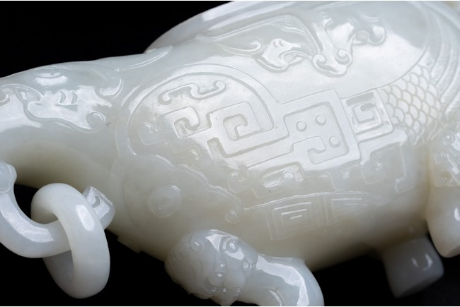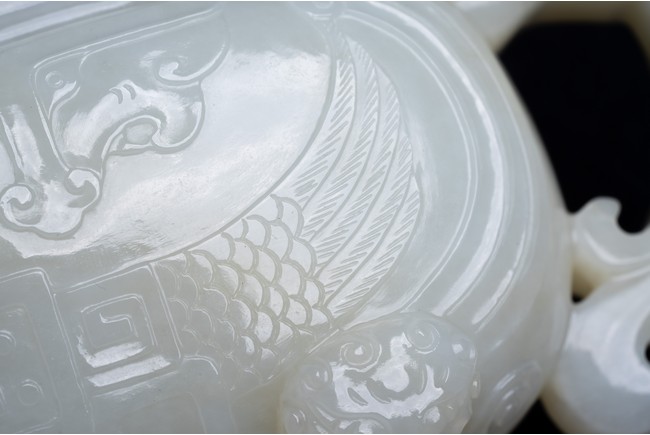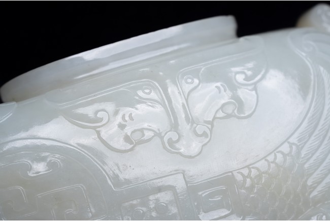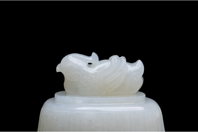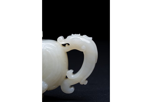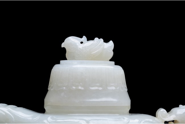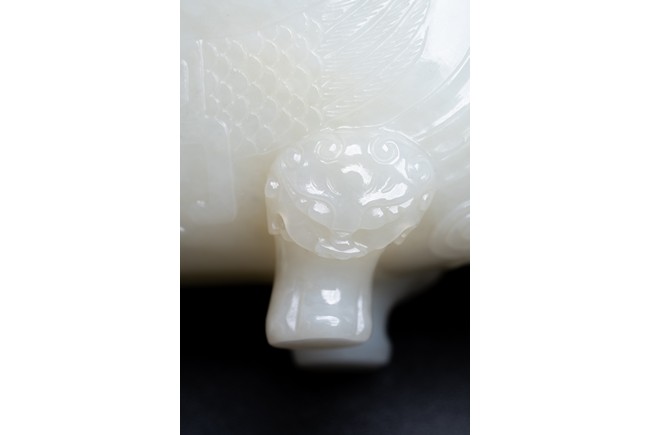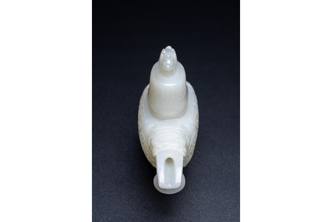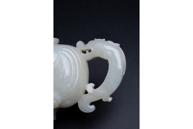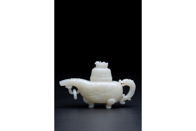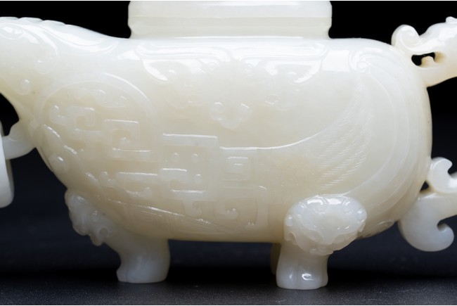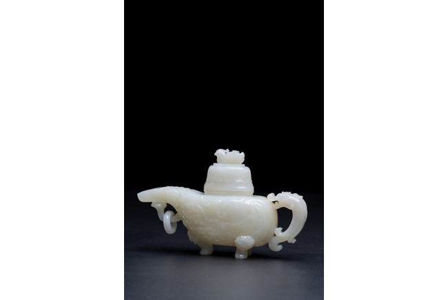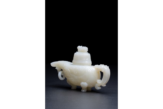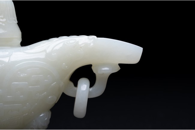 The yi is supported on three lion-head feet and is carved to the body with archaistic pattern. The handle is carved with a mythical beast terminal, and a beast-head with a loose ring below the spout. The cover surmounted with recumbent mandarin duck as finial. The stone is of even white tone.