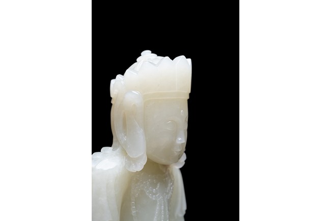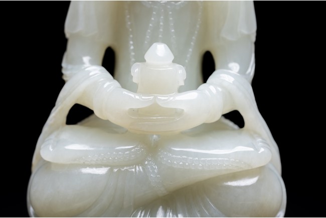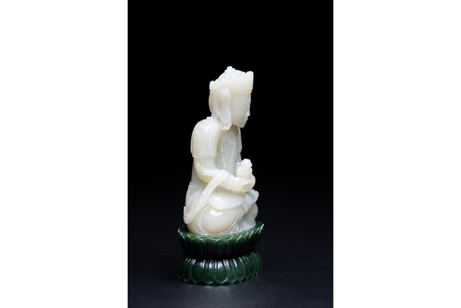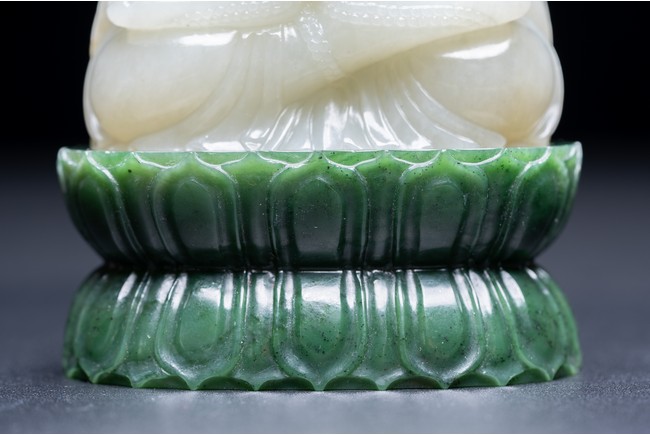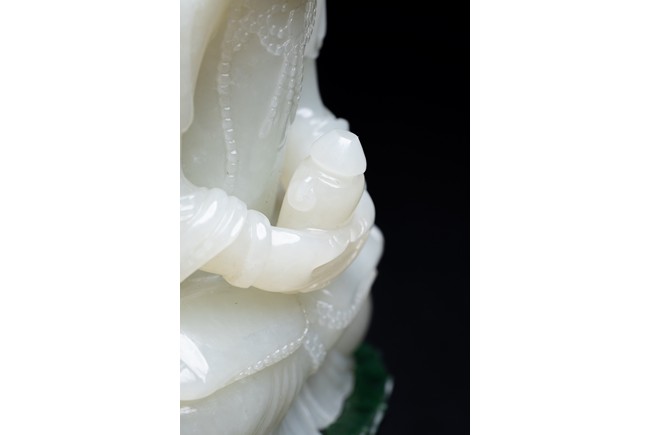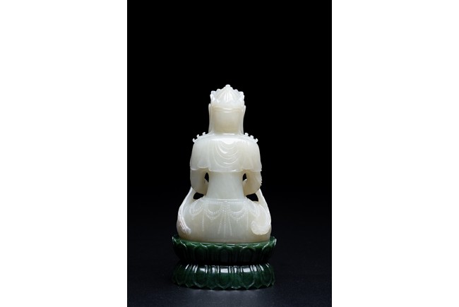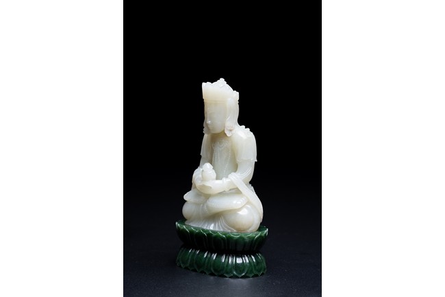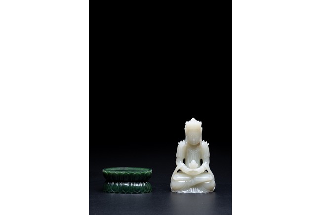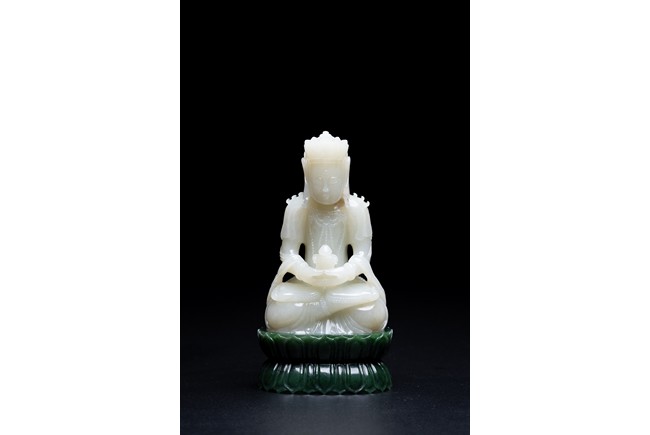 Carved seated in dhyanasana above green jade double lotus throne with the hands in dhyana mudra and supporting a vase, dressed in robes revealing bare chest adorned with elaborate necklace, the serene face beneath a crown, the stone of a even white tone. Qing Dynasty period.
