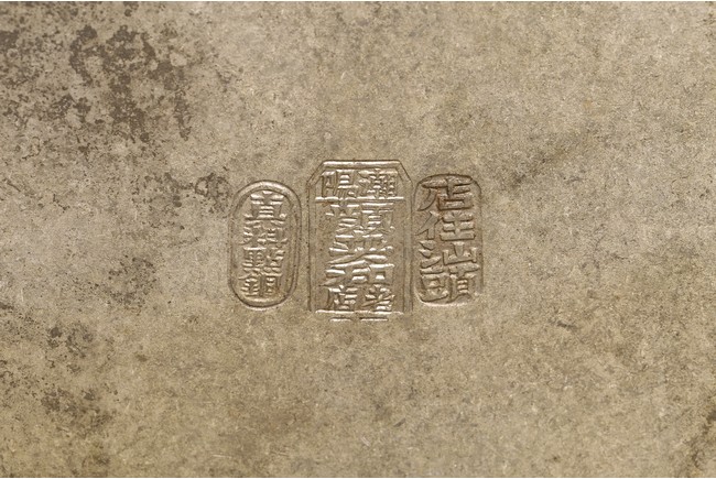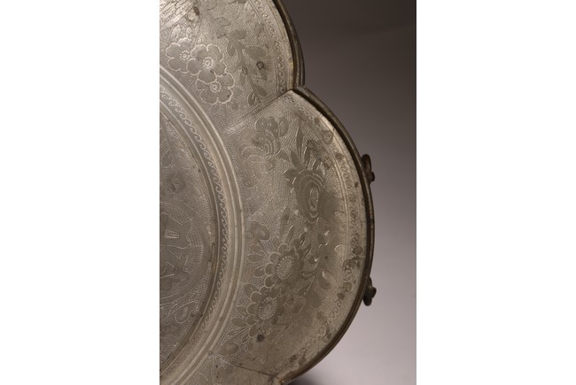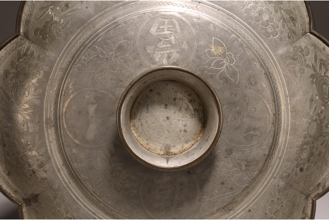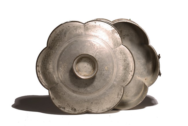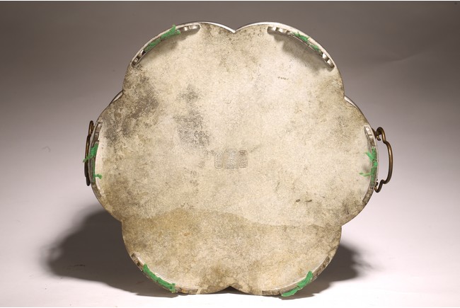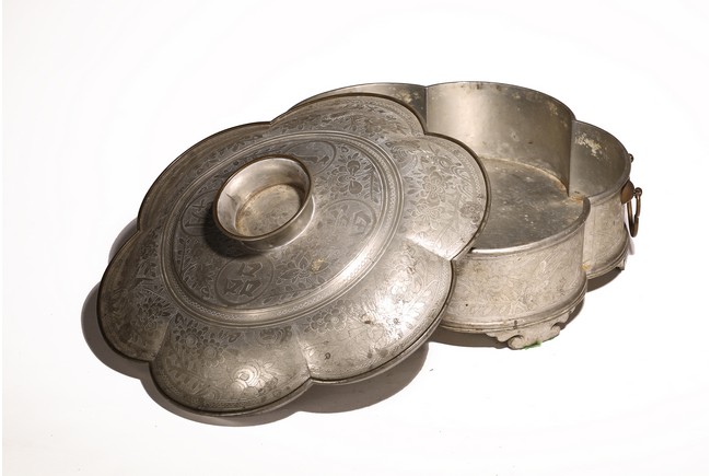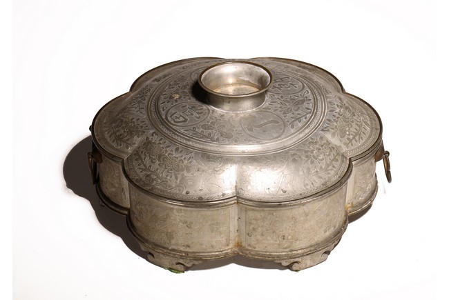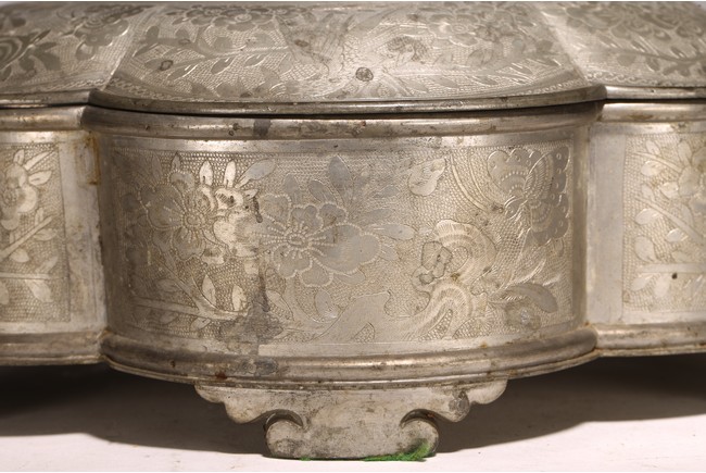 Chinese. Of lobed form, the top cover decorated with four characters Yi Pin Dang Chao within double line border, the outer border decorated with leafy flowers, the underside impressed with three inscription mark. 19th century Qing Dynasty period.