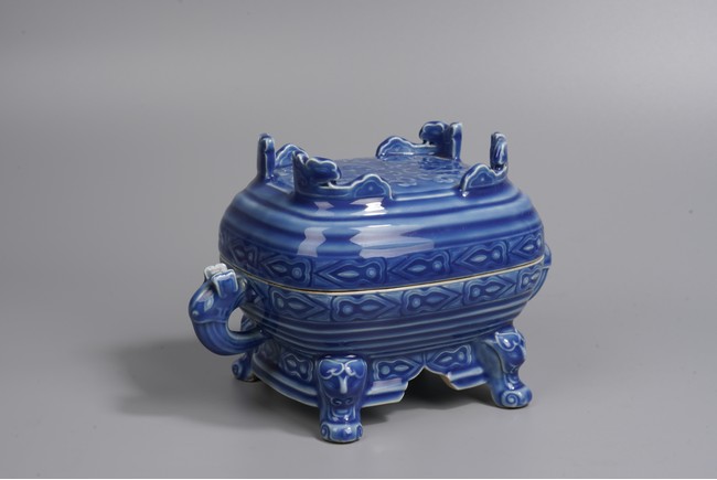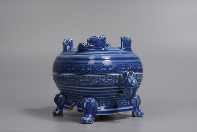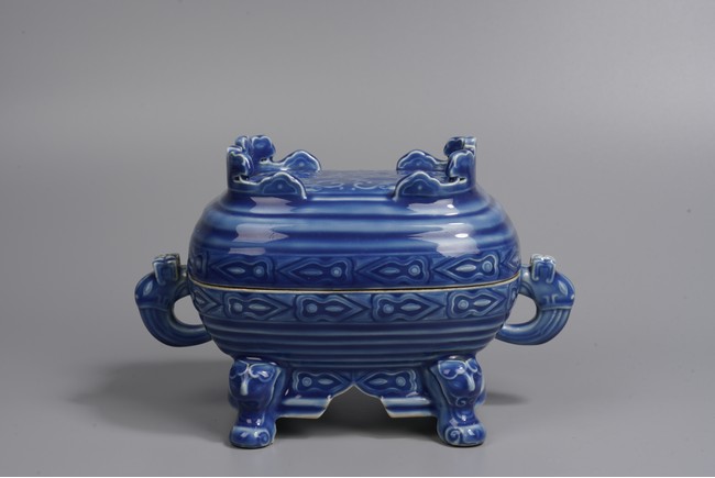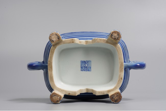 Of rectangular section flanked by loop handles, decorated in archaistic style, applied overall with a rich blue glaze, the base inscribed with a reign mark.