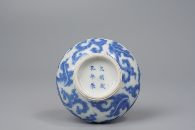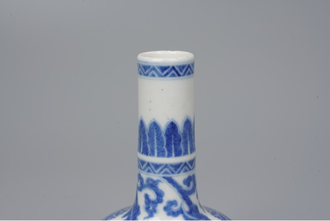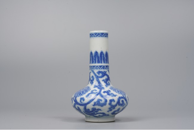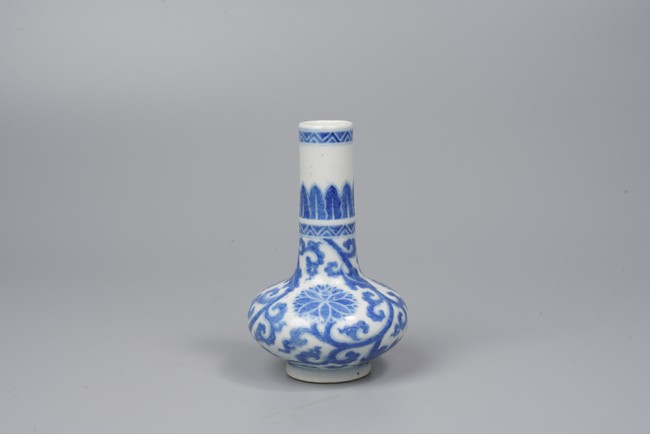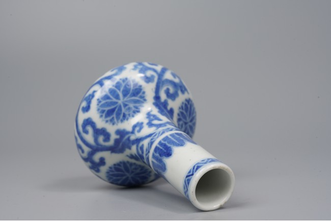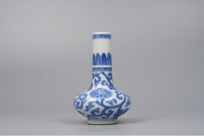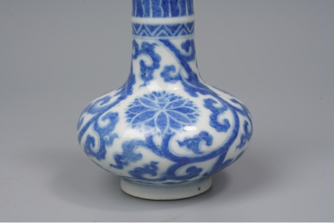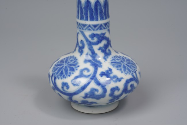 The compressed globular body rising to a long, cylindrical neck, painted with lotus blossoms on curling vines with furled leaves, the base inscribed with apocryphal chenghua reign mark. Qing Dynasty period.