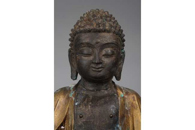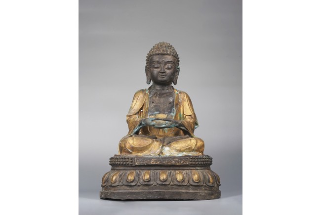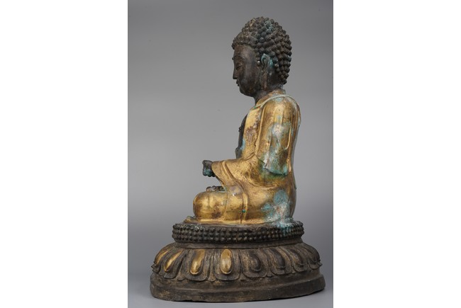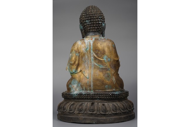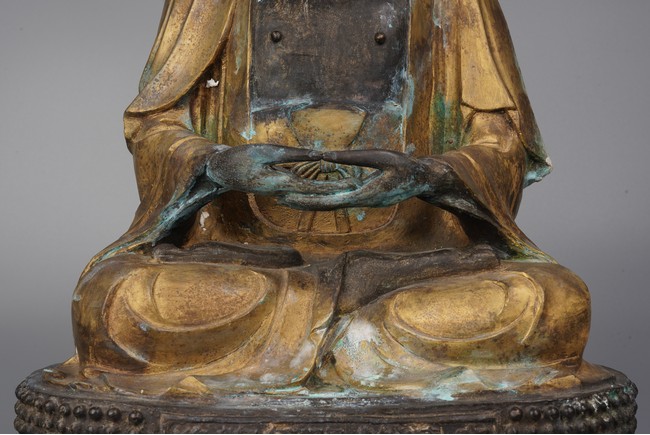 Chinese. cast seated on lotus throne cast to the front with Qianlong reign mark, the hands in dhyana mudra, the dhoti sashed at the waist, the bowed head with a serene expression, downcast eyes, elongated ears, and tightly coiled hair.