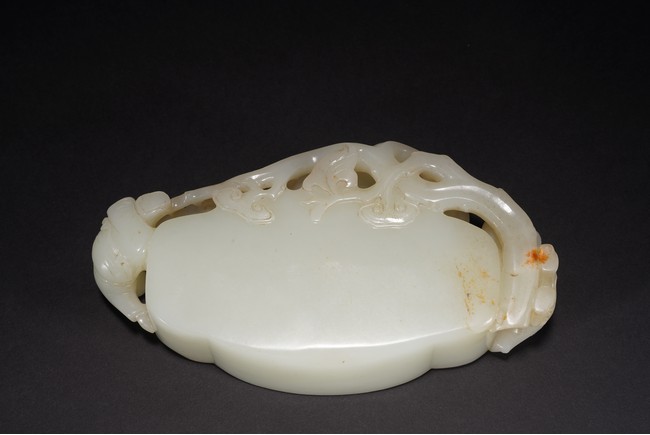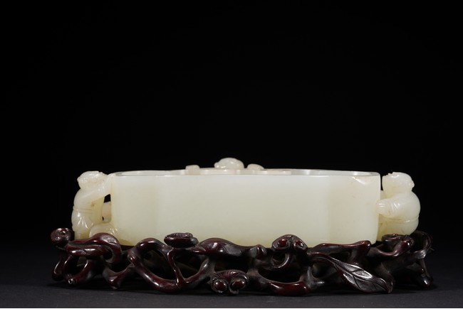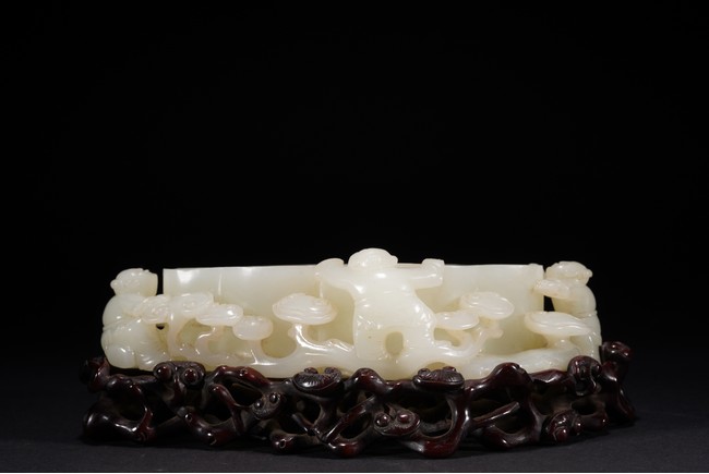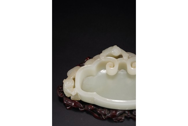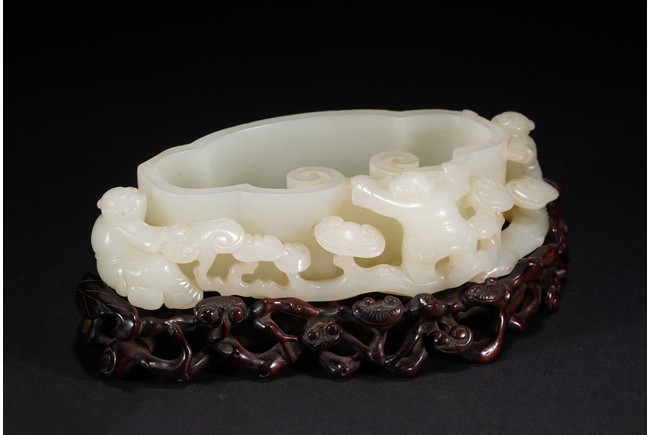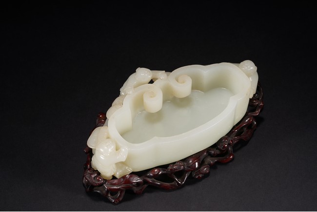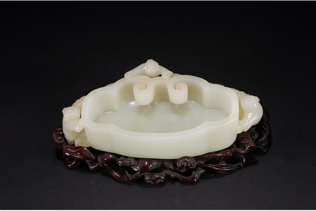 The washer is carved in the form of ruyi head shape, finely carved in openwork on the exterior with boys resting on lingzhi fungus borned branches, the stone is of smooth and translucent white tone, hardwood stand. Qing Dynasty period.
