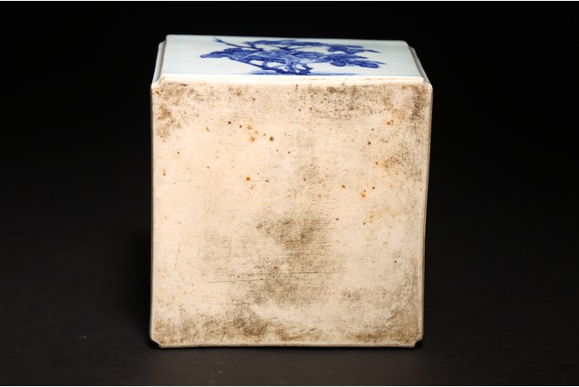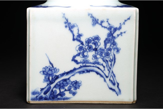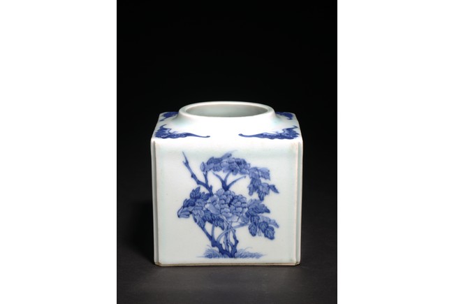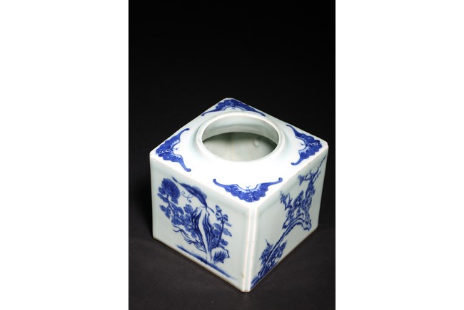 Chinese. Of square form, each side of the exterior body painted in blue and white with chrysanthemum, plum blossom, lotus, and peony. The top further decorated with four bats flanking the circular mouth. Base unglazed. Mid-Qing Dynasty period.