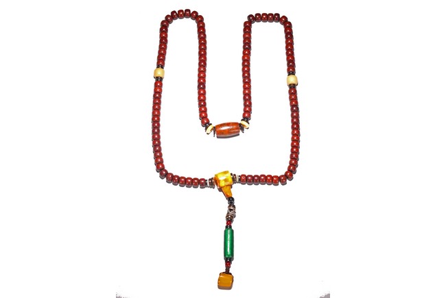 Chinese or Tibetan. Consisting of polished red puti beads spaced by large agate beads. Late Qing or Republic period.