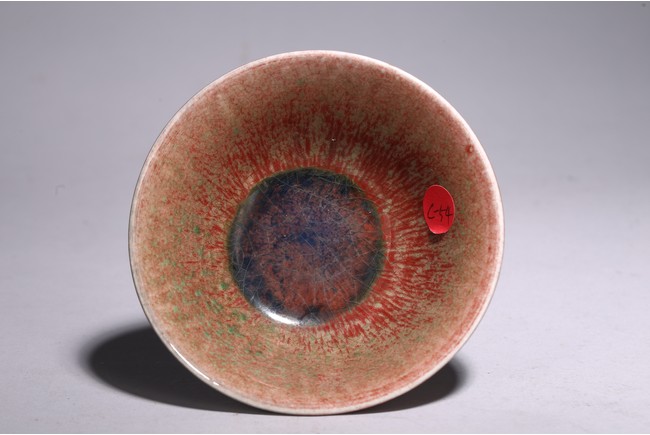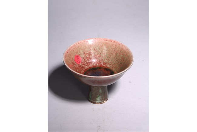 The deep cup with rounded sides raised on a spreading stem, overall suffused with crimson tone with an attractive mottling of lighter pink and green shades. Qing Dynasty period.