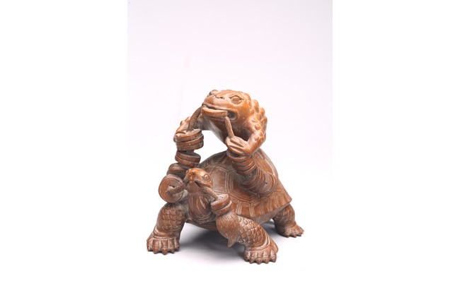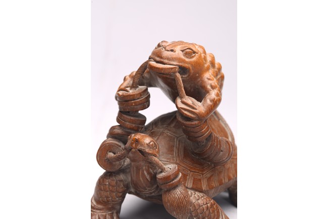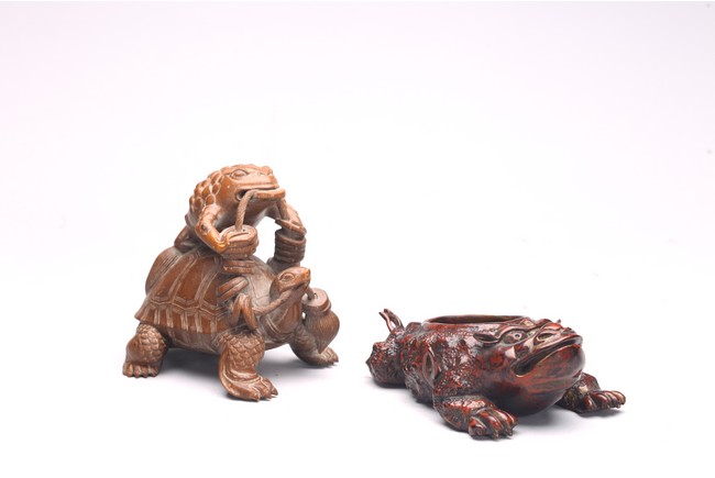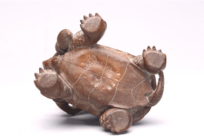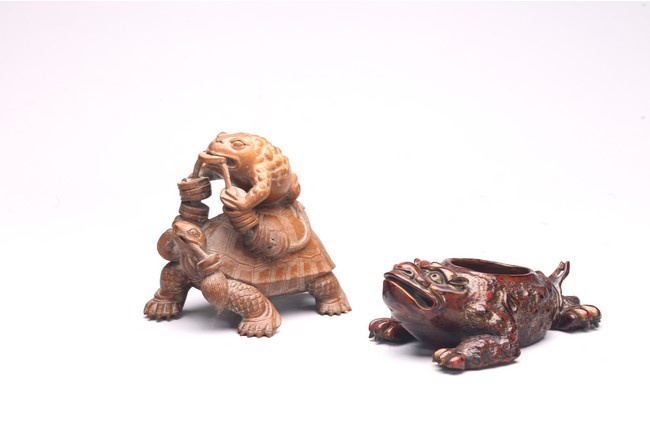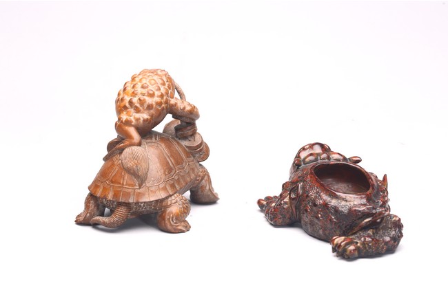 Comprising of a wood carved toad and a turtle.