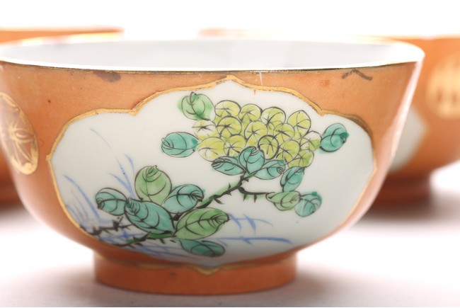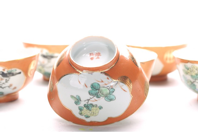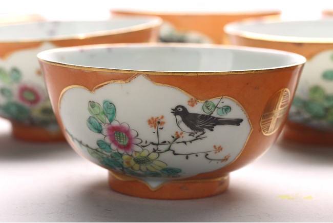 Each decorated with flowers and birds reserved on coral-red ground. Qing Dynasty period.