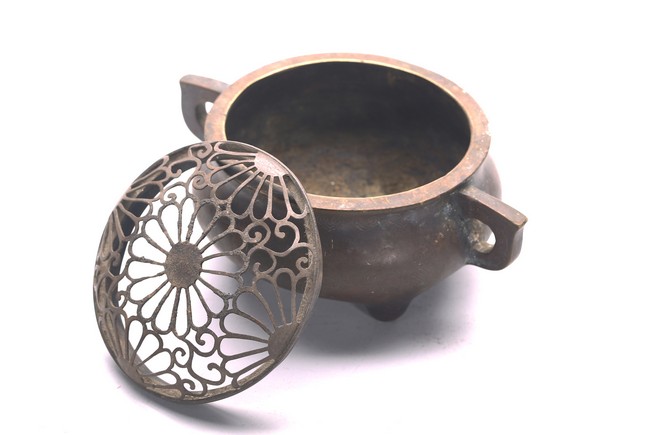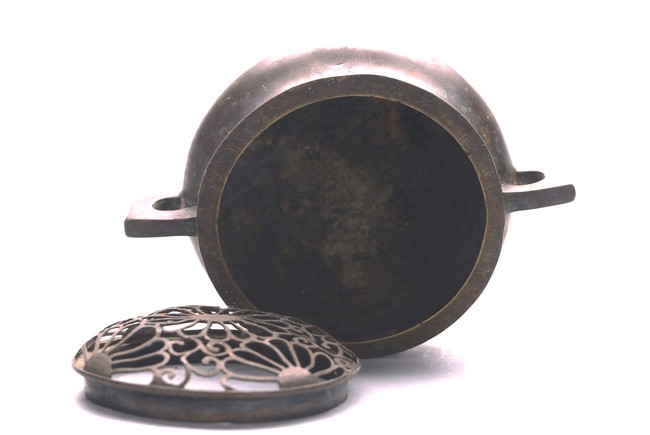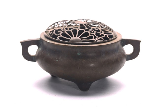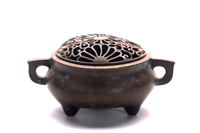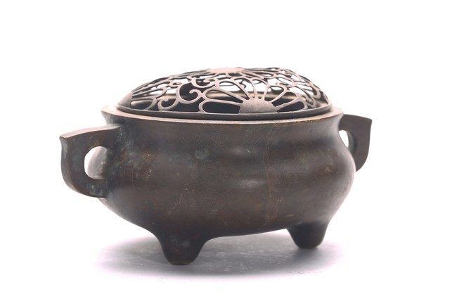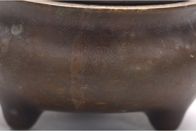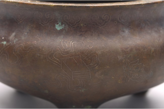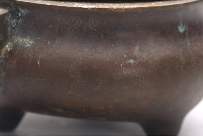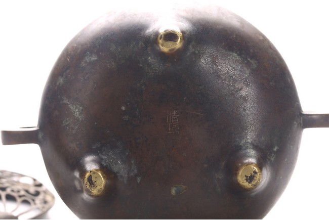 The compressed globular body rising from three short tapering feet, with loop handles at the shoulder, the base with two-character mark. Qing Dynasty period.