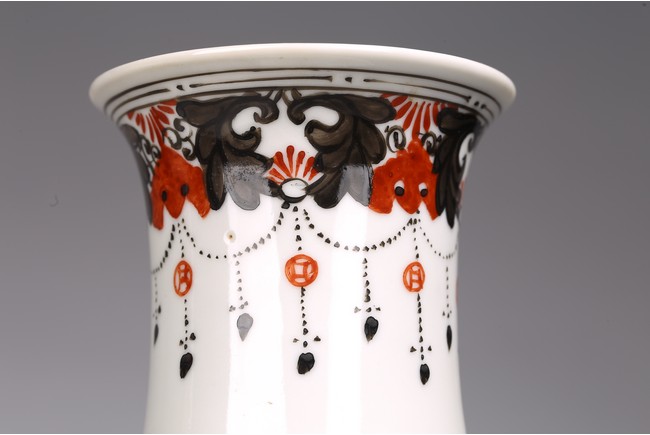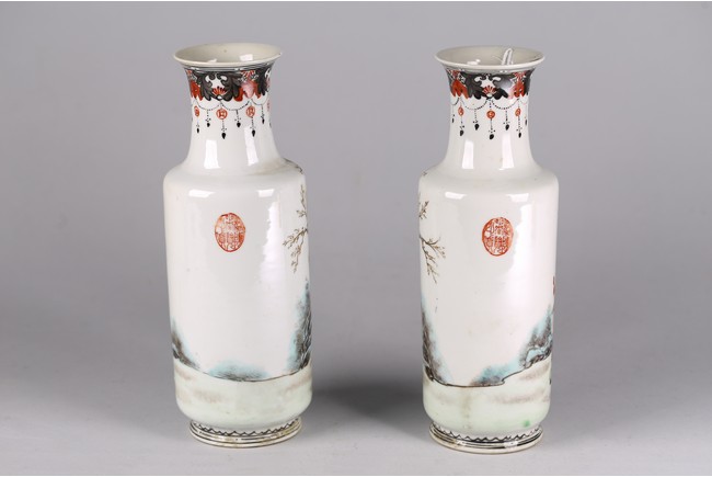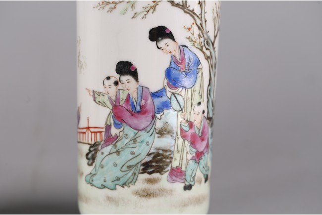Each of cylindrical form, the vase decorated with mother and children in garden, base inscribed with mark. Republic period.