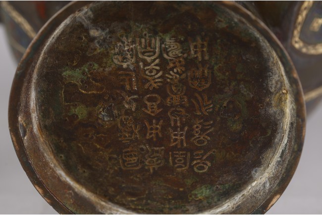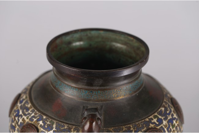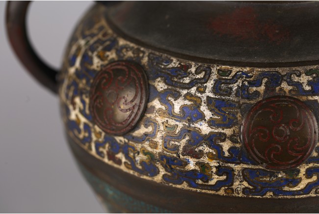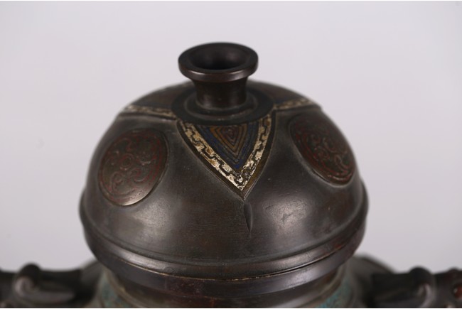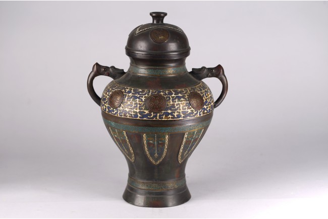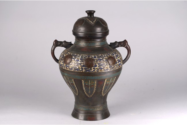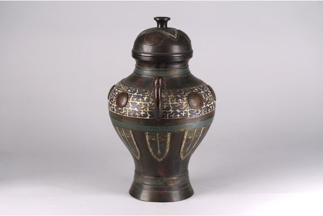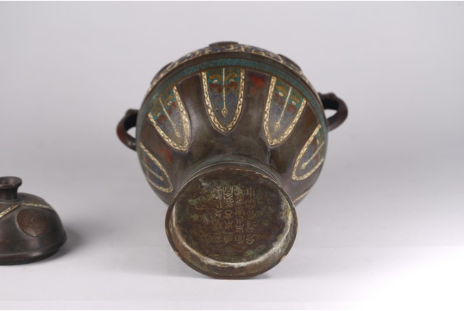 In the form of a lei, the baluster body rising from a rounded foot to a waisted neck and galleried rim, the center decorated with band of cloisonne enamel archaistic pattern, set with pair of handles, completed with domed cover, the base inscribed with inscriptions. Qing Dynasty period.