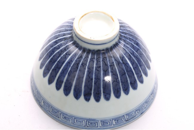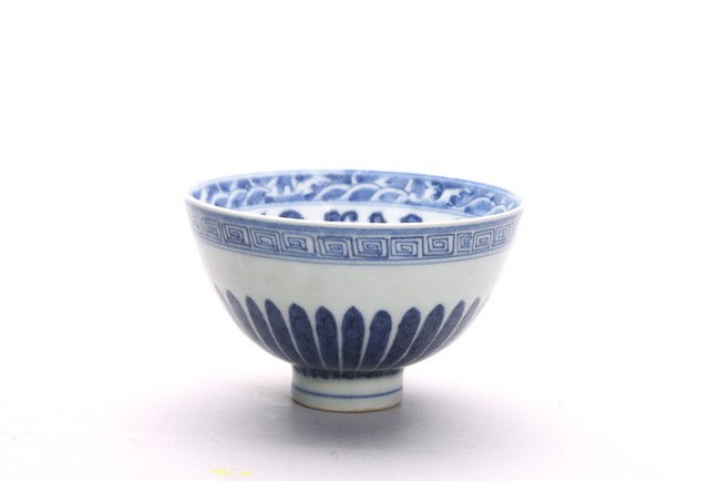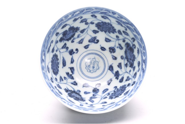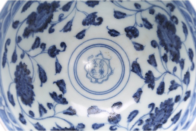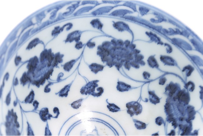 The bowl decorated with lotus scrolls to the interior wall and upright petals around the exterior.