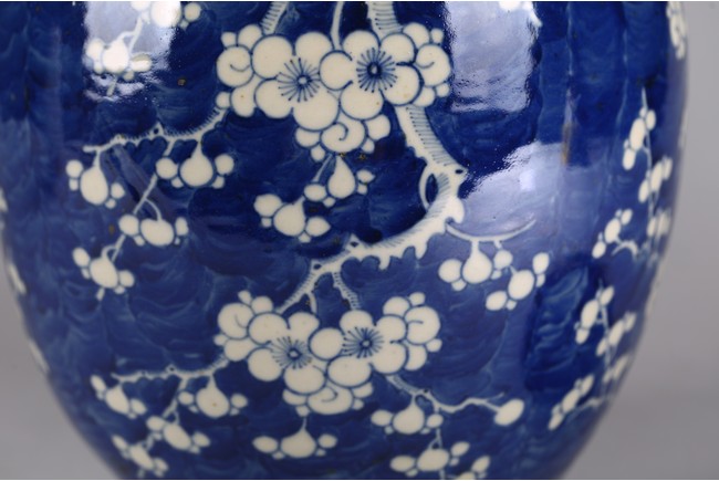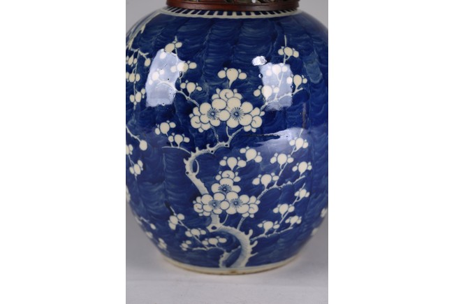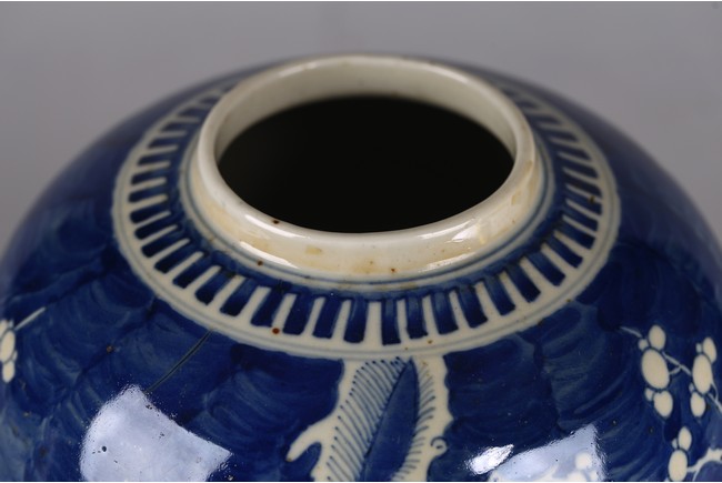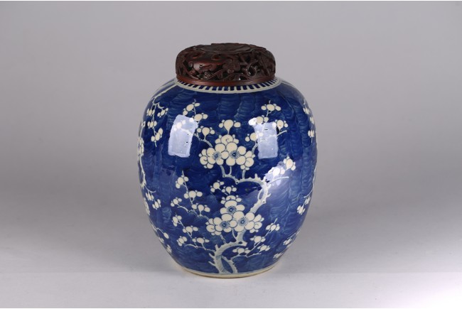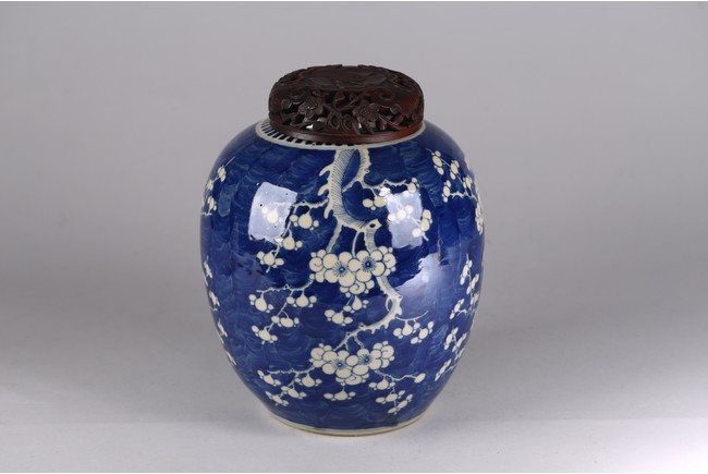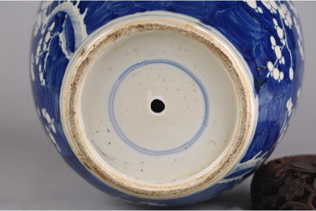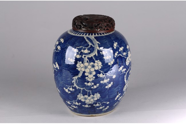 Decorated with plum blossoms around body, with reticulated hardwood cover. Qing Dynasty period.