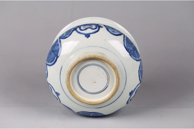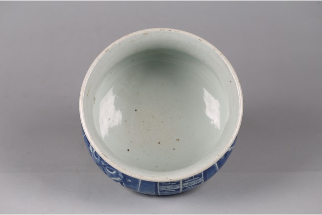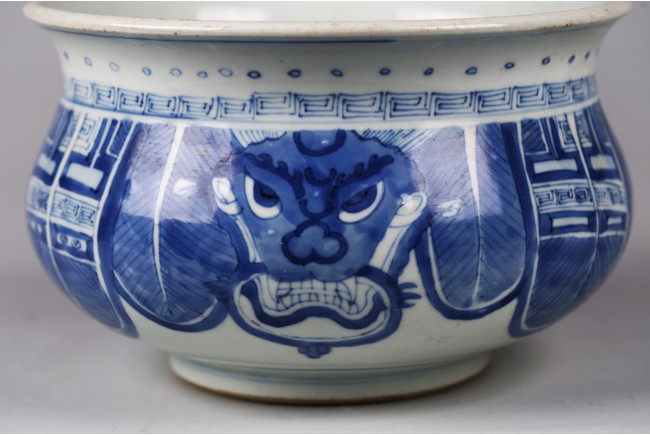 Of bombe form, the sides painted in cobalt blue with band of archaistic mythical beast mask and plantain leaves pattern, the recessed base with a double circle. Qing Dynasty period.