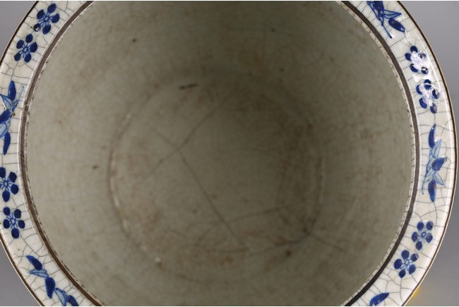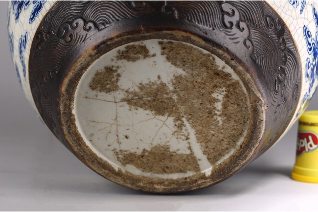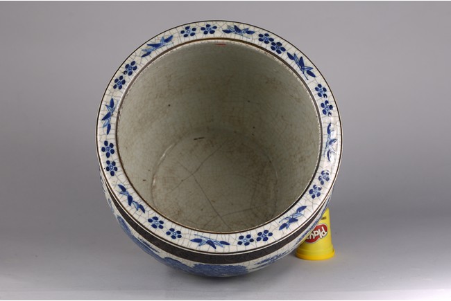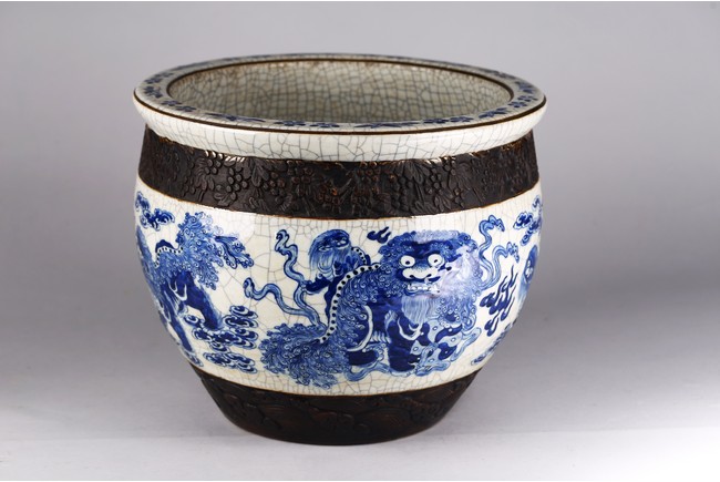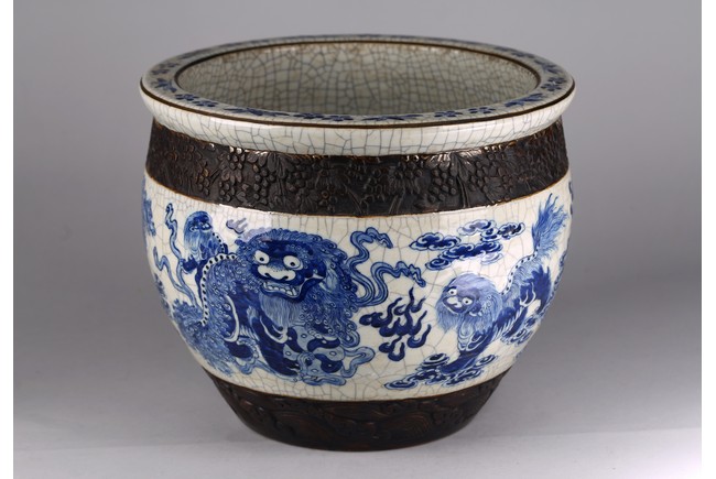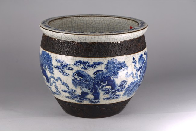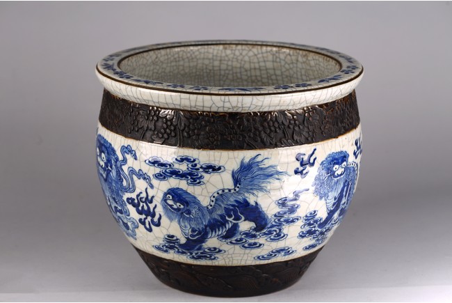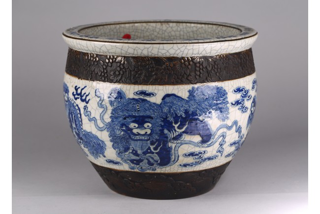 The body painted in cobalt blue with various buddhist lions around the body, the interior covered with crackled white glaze. Qing Dynasty period.