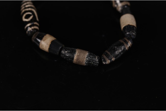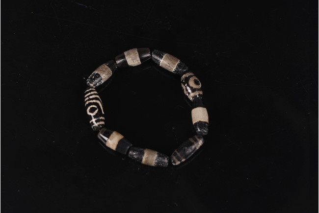 The antique oval shaped Tibetan dzi beads consisted of curvilinear lines, circles or eyes, and bands, strung together forming a bracelet.
