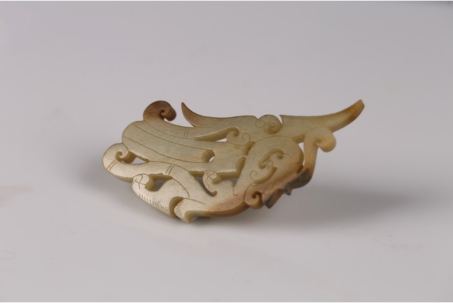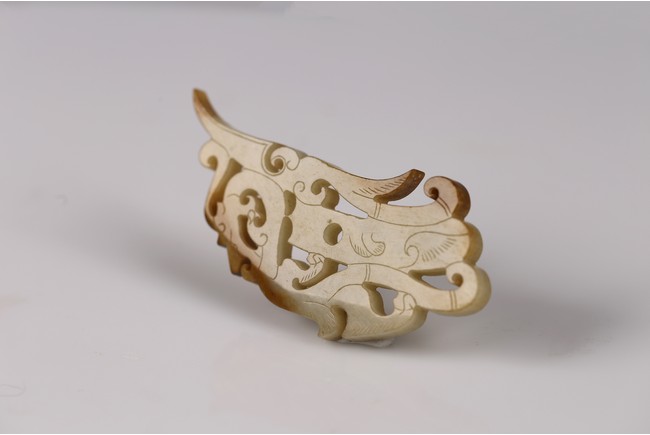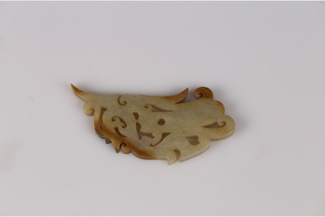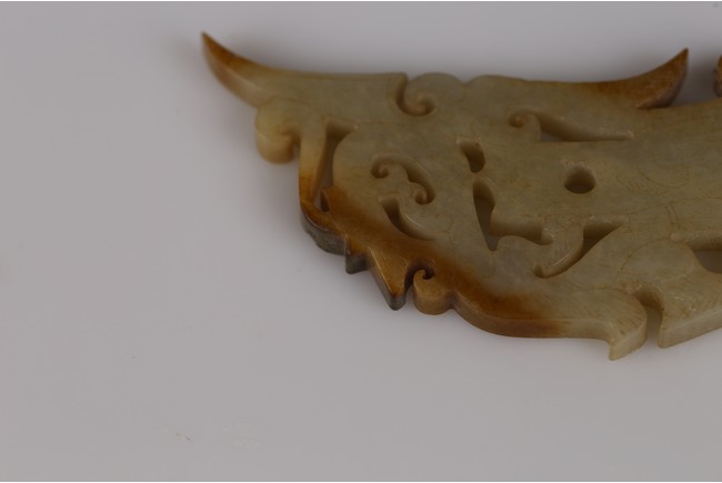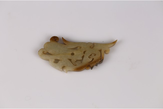 Of pointed shape, carved in openwork with finely incised scrolls and lines, the stone is of celadon tone with russet and dark brown inclusions on the outer edges.