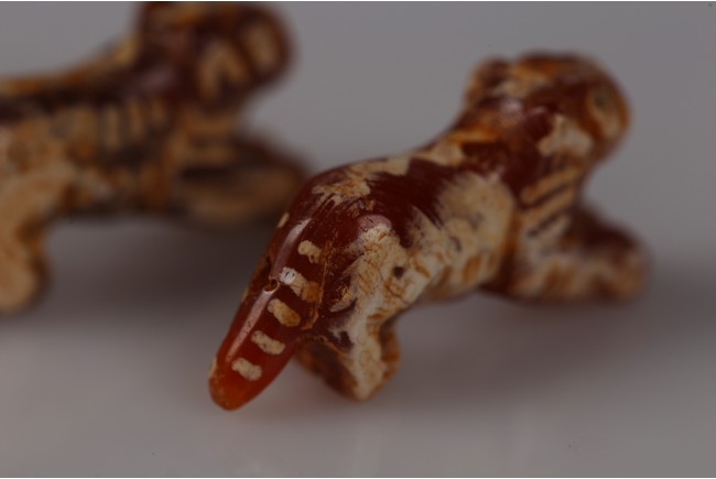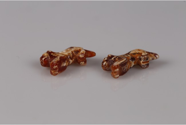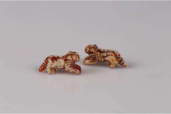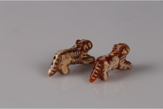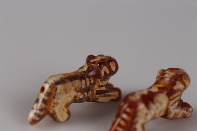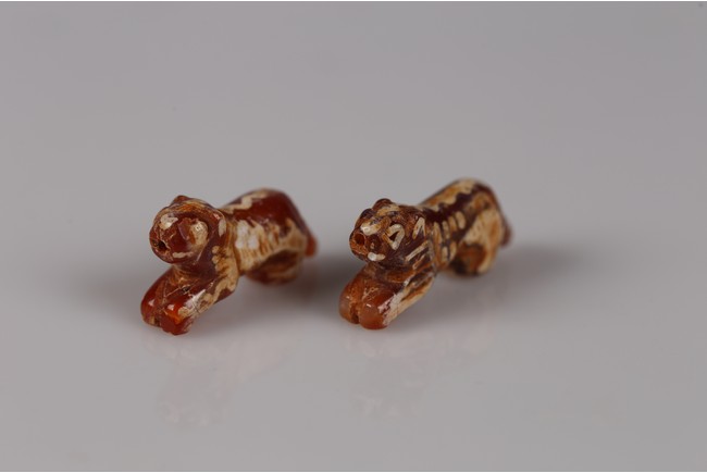 Samon Valley Culture. 800 BC-200 AD. Burmese. Each carnelian agate bead carved in the form of crouching tiger, the body overall adorned with short white bands and patches, the mouth and tail drilled with holes for suspension.