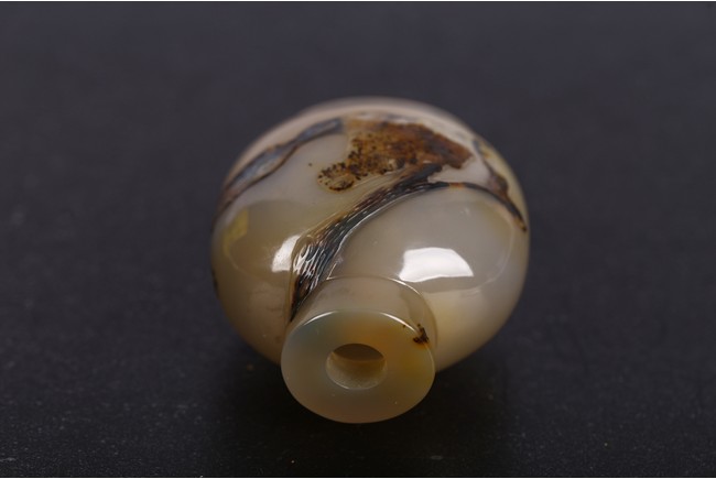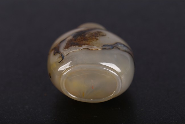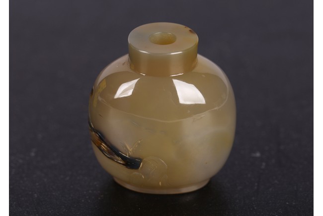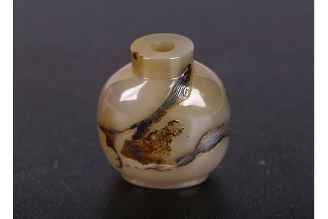The bottle is relief-carved incorporating shadow inclusions to depict a large pine emerging from rocks. Qing Dynasty period.