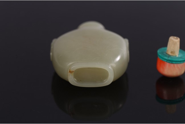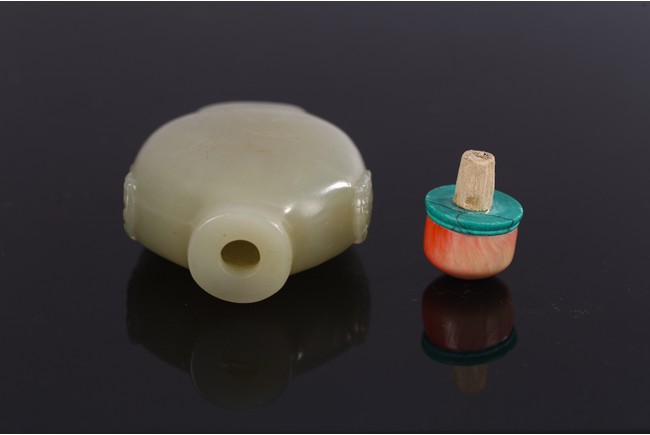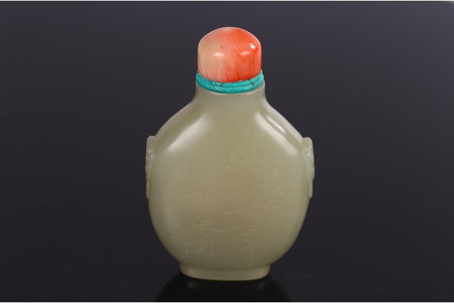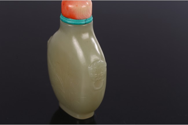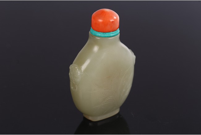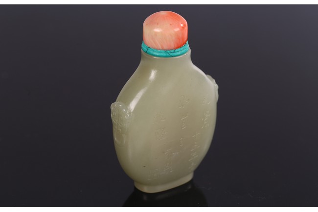 Carved on one side with orchids, reverse inscribed, body flanked by two raised beast mask heads as handles, with stopper.
