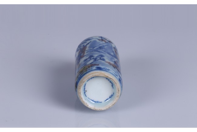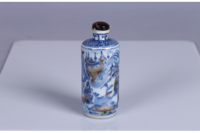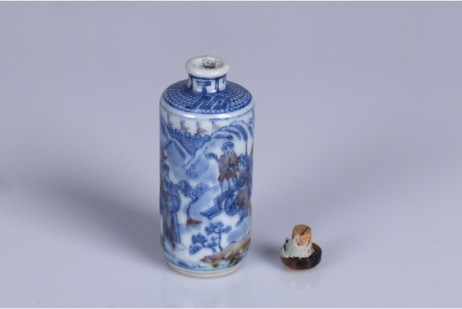 The body painted with warring figures in cobalt blue and highlighted in underglaze red, with stopper. Qing Dynasty period.