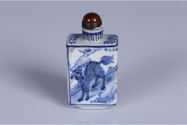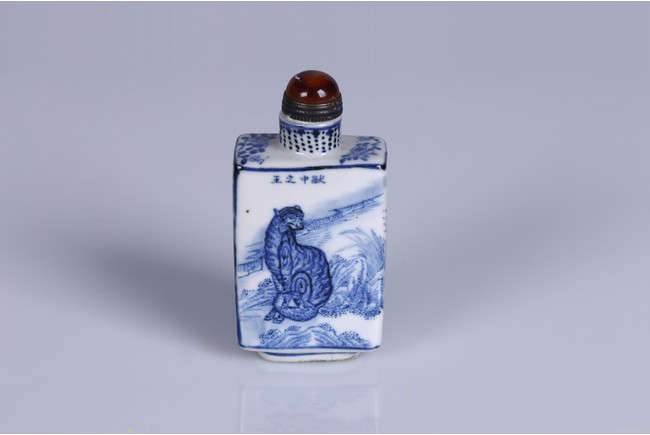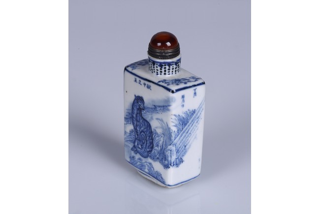 Of rectangular form, painted with a seated tiger by river, the reverse painted with a Qilin, with inscriptions, base inscribed with apocryphal reign mark. With stopper. Qing Dynasty period.