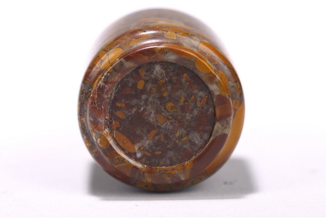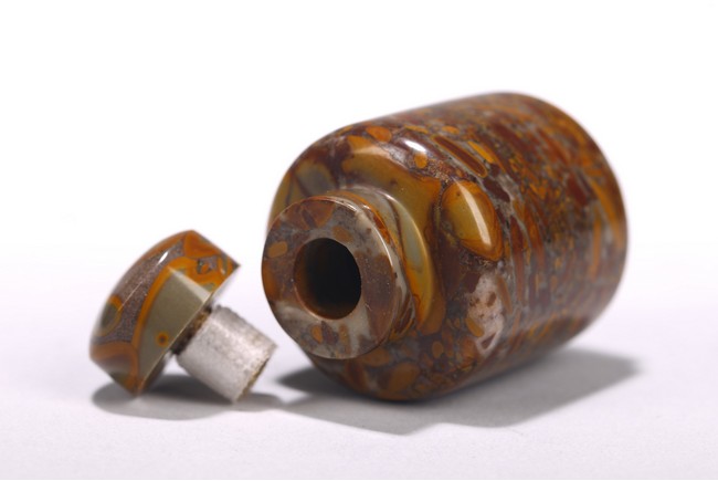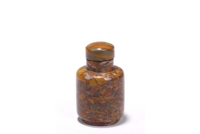 Of cylindrical form, the body and neck composed of attractive large and small russet, yellow, brown, orange reminiscent of 'pebbles' and 'rocks', fitted with a similar puddingstone stopper. Qing Dynasty period.