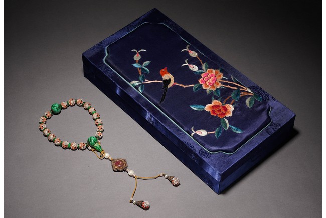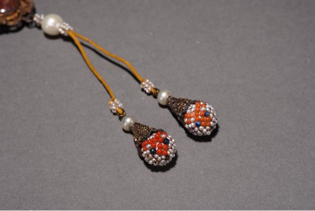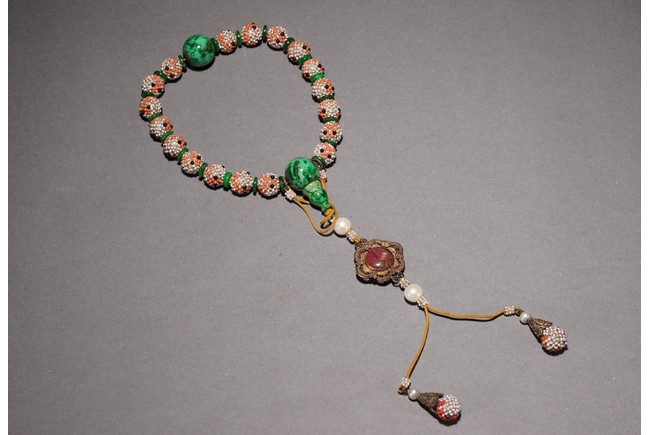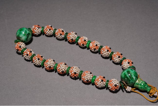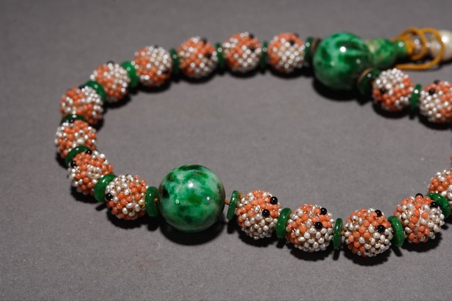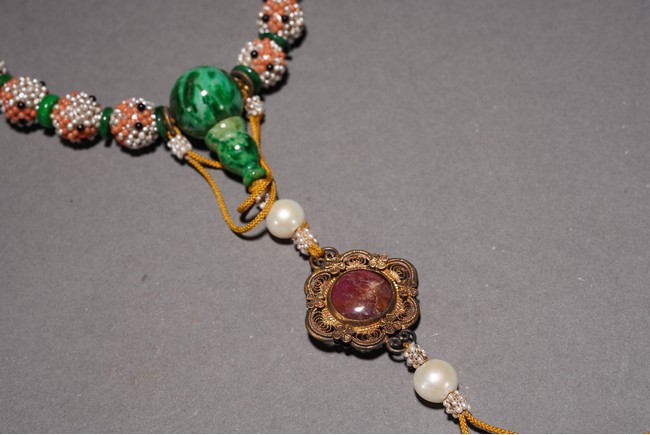 Composed of 18 pearl cluster beads divided by jadeite disc and two large jadeite beads, further suspending a gilt metal-mounted tourmaline oval plaque above two pearl cluster drops. Qing Dynasty period or republic period.