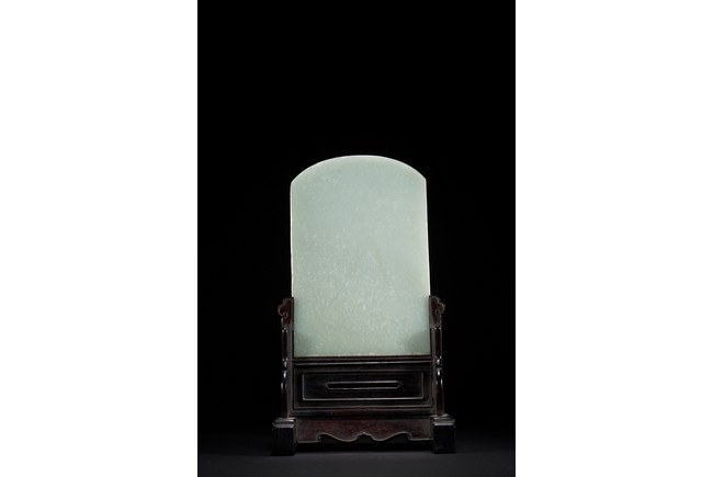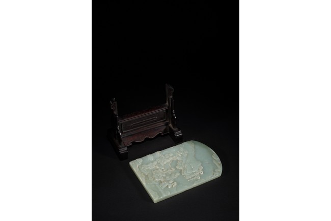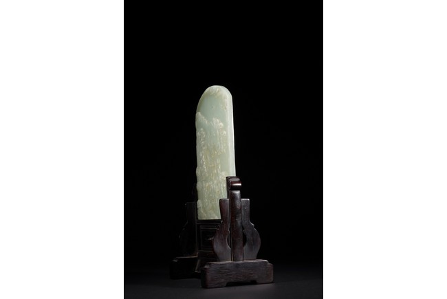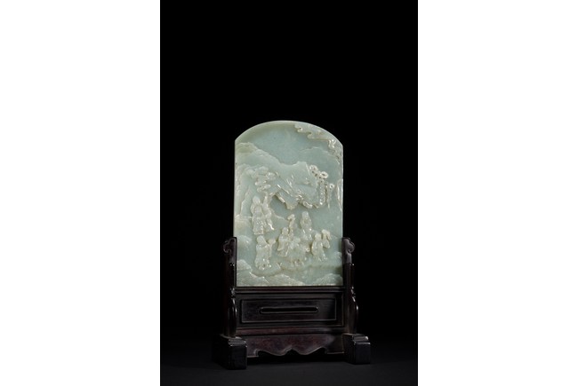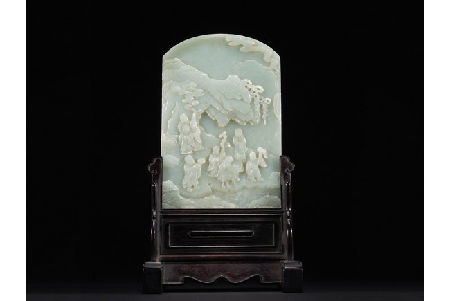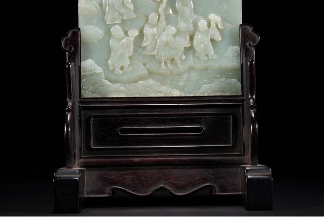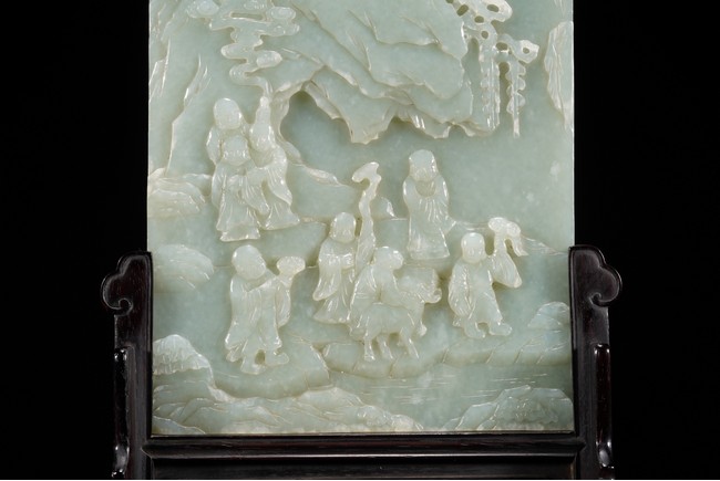 The screen carved with eight arhat immortals standing on river bank under large rocky outcrop. The stone is of greenish white tone. Republic period.