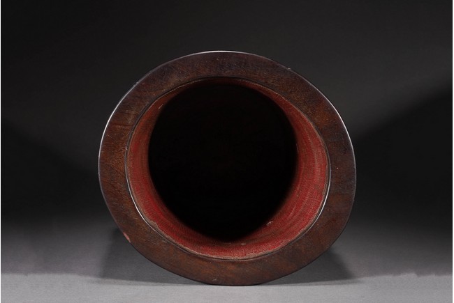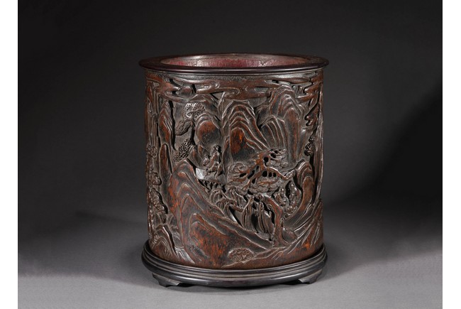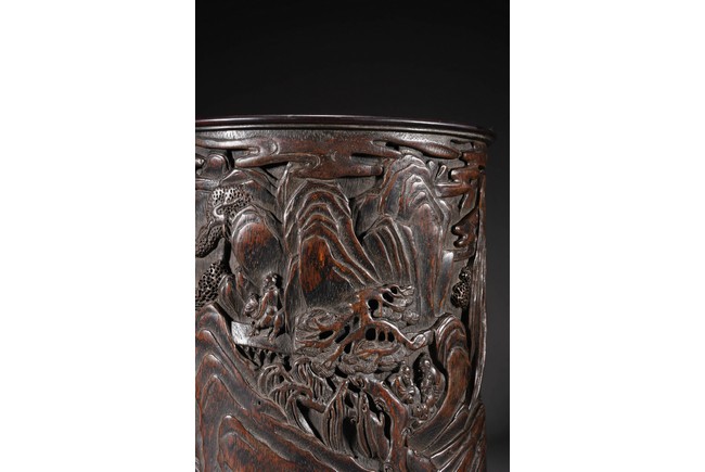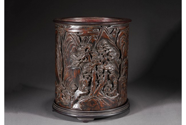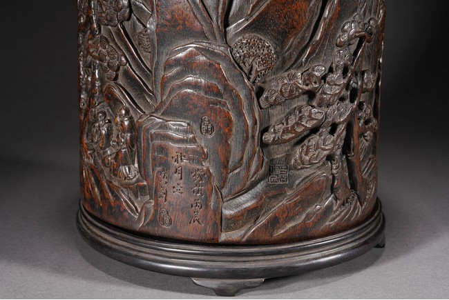 The brushpot is finely carved in relief with mountain landscape with scholar figures engaging in various leisures. The lower side inscribed and with three seal marks. The agarwood is of of a darkish brown tone and with characteristic aroma.