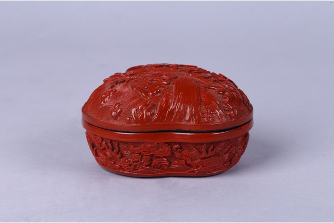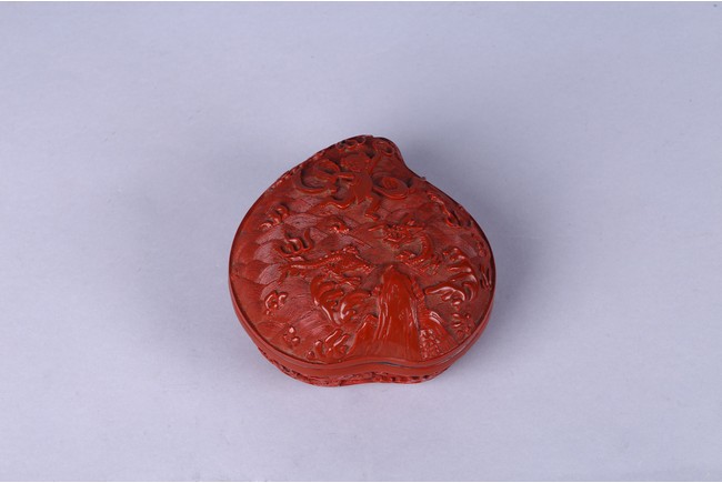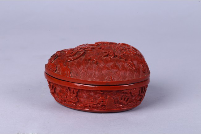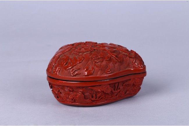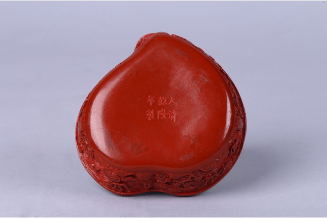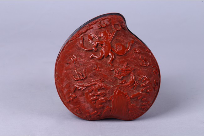 The peach-shaped box carved with the boy from legend 'Ne Zha' fighting the dragon amidst the sea, the interior covered in black lacquer, the base inscribed with apocryphal Qianlong mark.