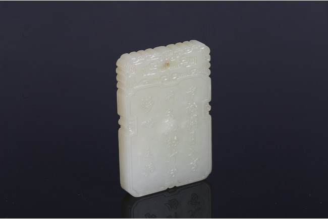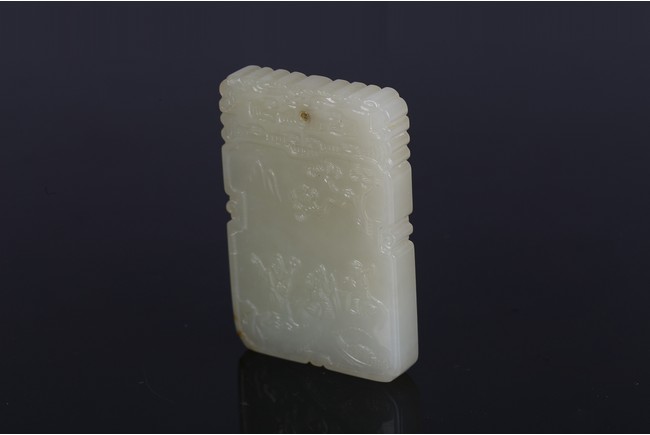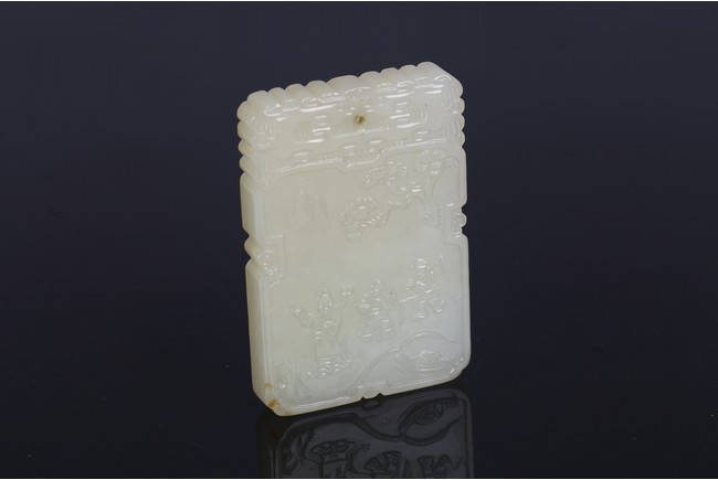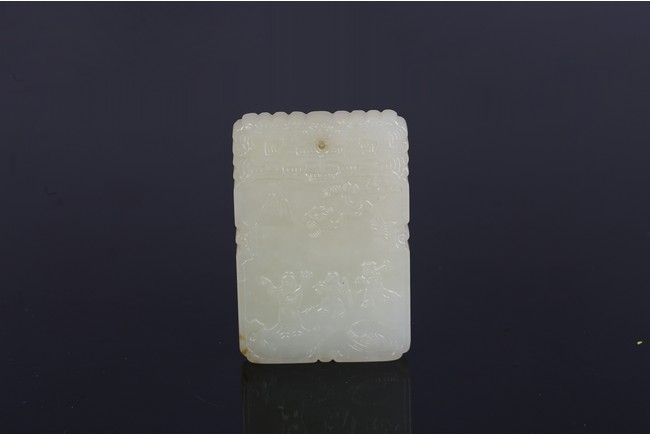 Carved with an elderly scholar accompanied by two boys to the front, the reverse further inscribed with poem in a cursive script. The stone is of translucent white tone. Qing Dynasty period.