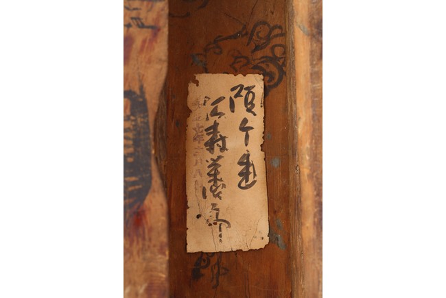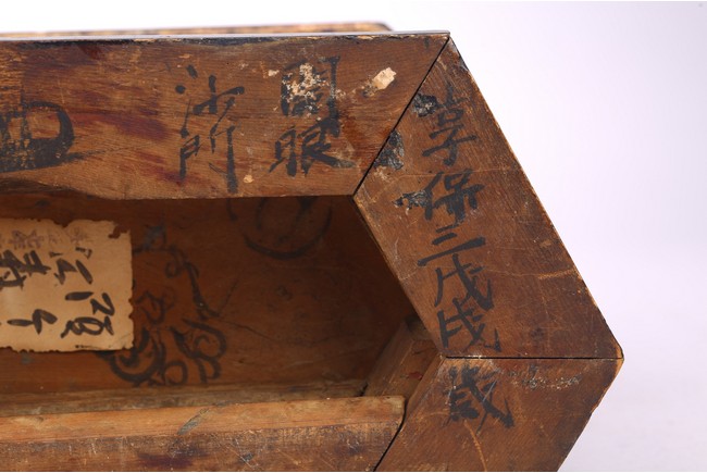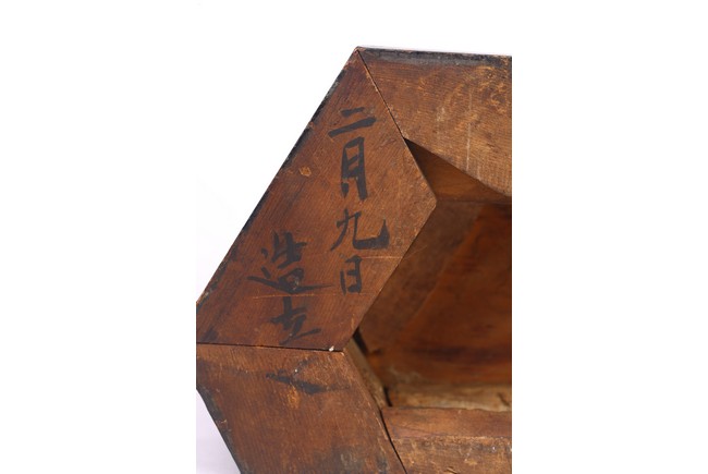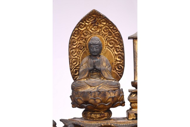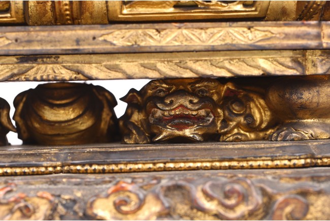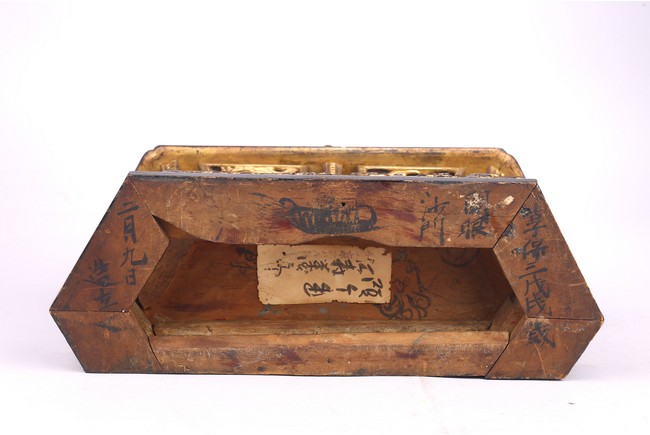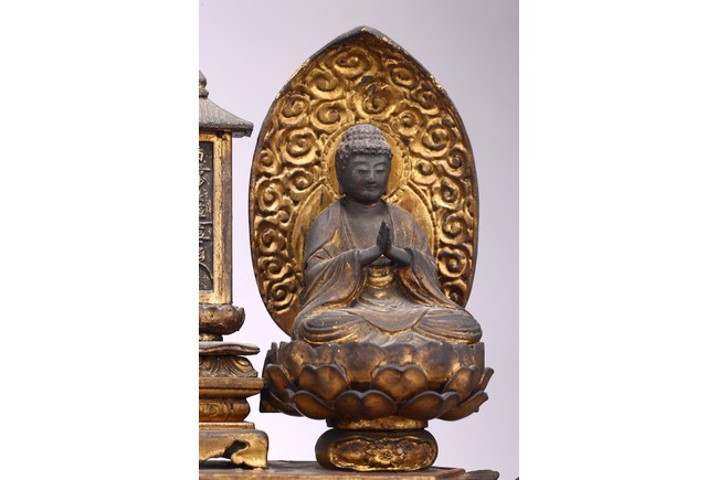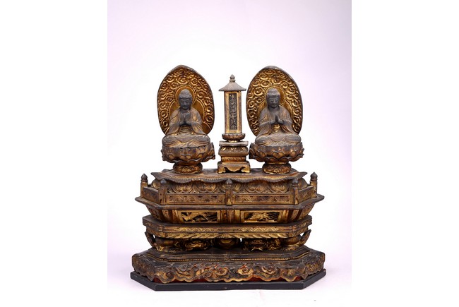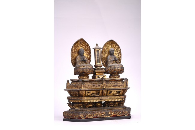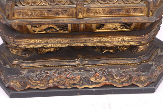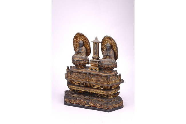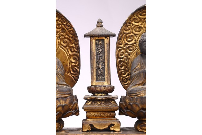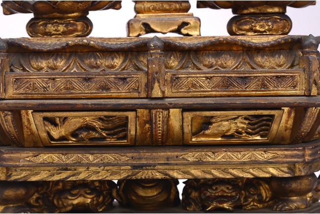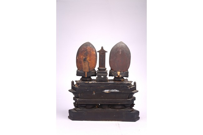 Carved in the form of two buddhas seated on lotus stand against mandorla flanking a pagoda with inscriptions, all supported upon a tiered platform with ornate carvings. Japanese. Edo period, 19th century.