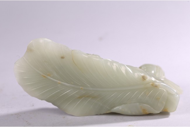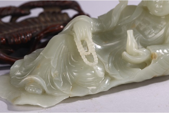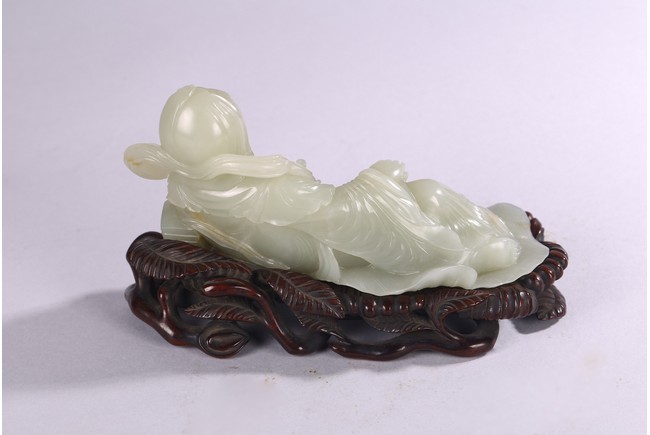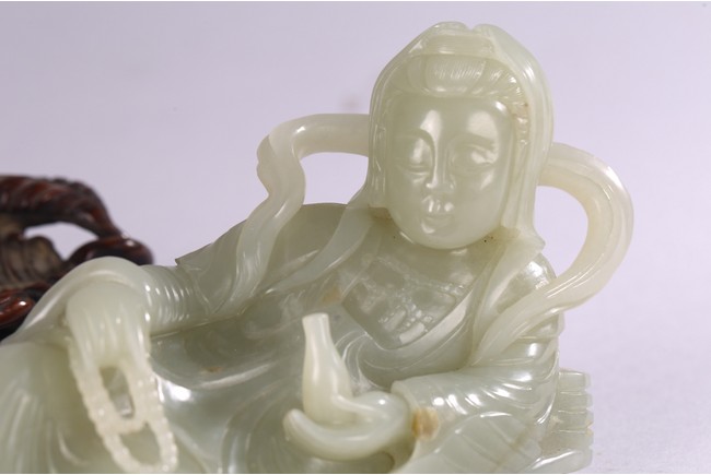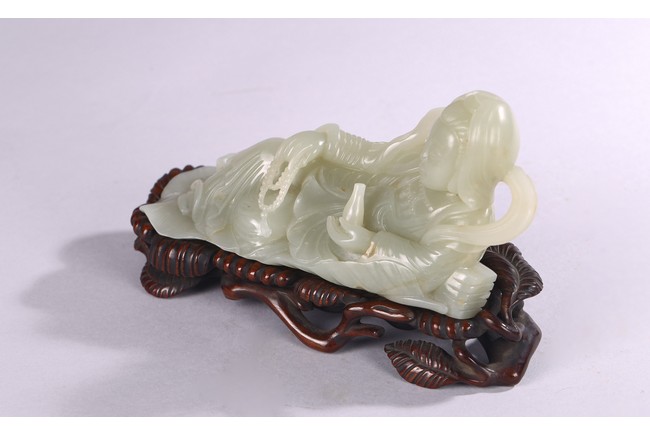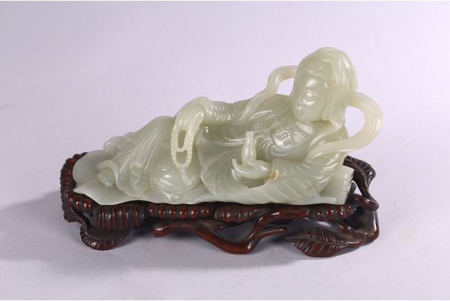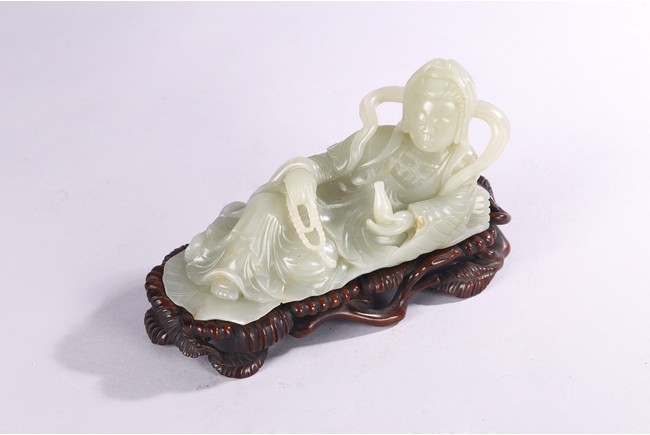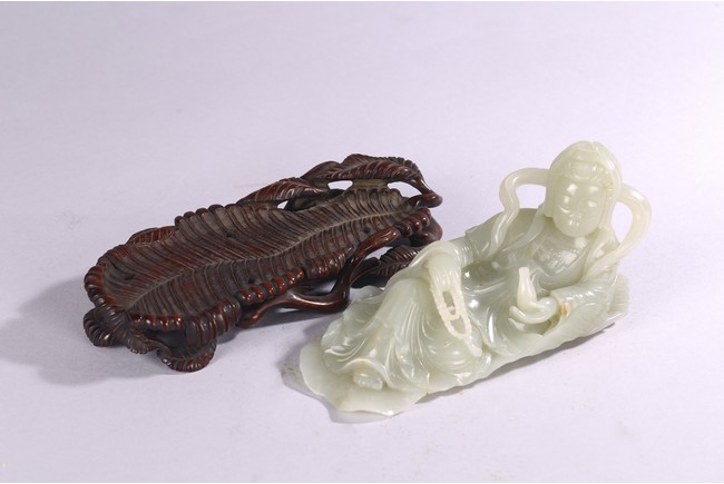 Carved in the form of a reclining Guanyin holding vase on one hand and rosary bracelet on the other, wearing flowing robe with flying ribbon across shoulder, all supported on a matching rosewood stand carved in the form of a leaf. Qing Dynasty period.