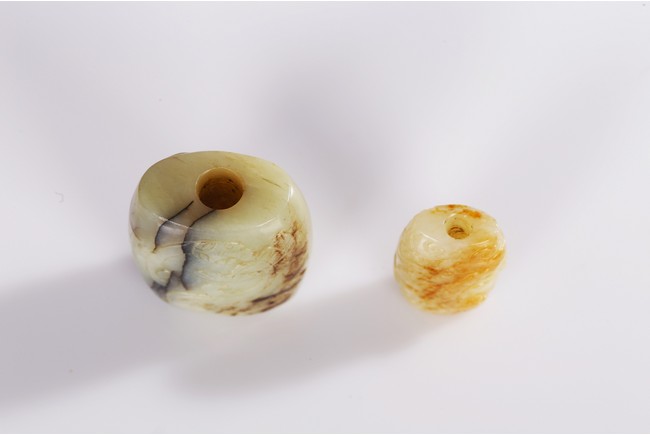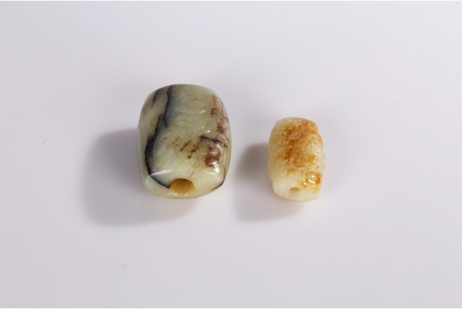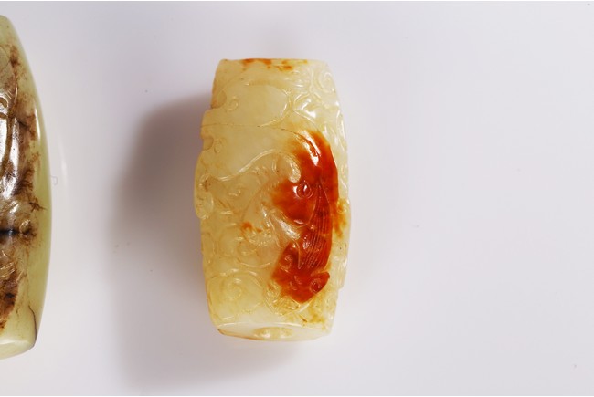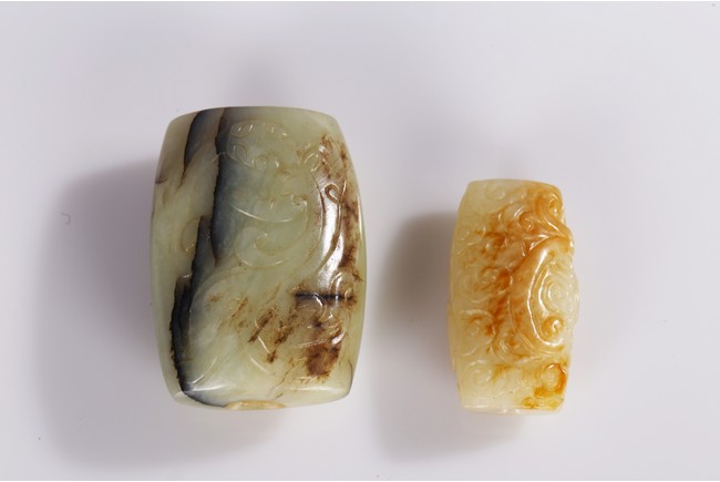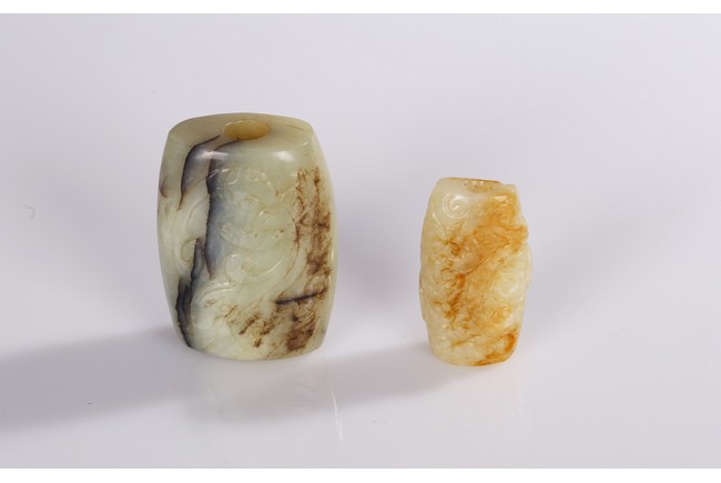 Of barrel form, each carved in relief with a coiling dragon, the stone with inclusions. Qing Dynasty period.