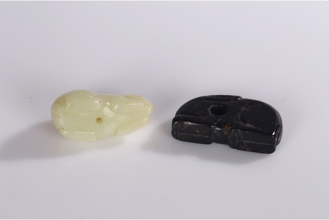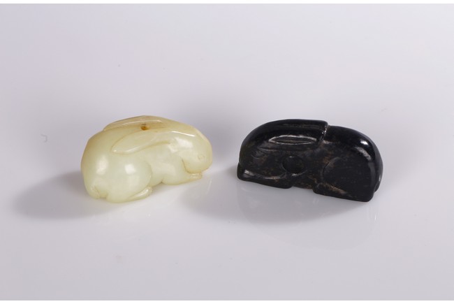 TWO CHINESE WHITE AND BLACK JADE RABBITS 民國/清 黑白玉雕兔墜一組