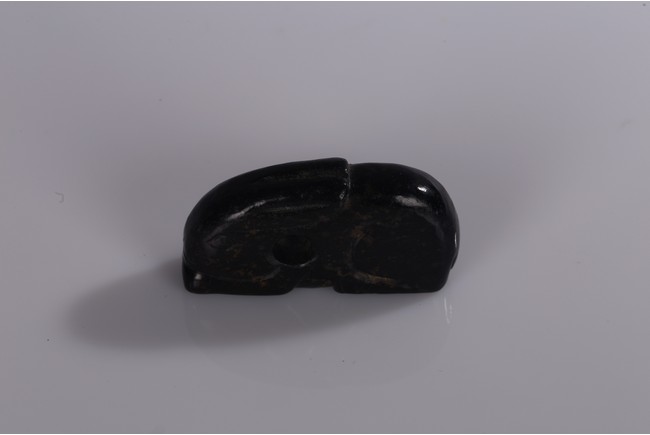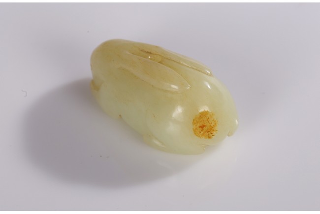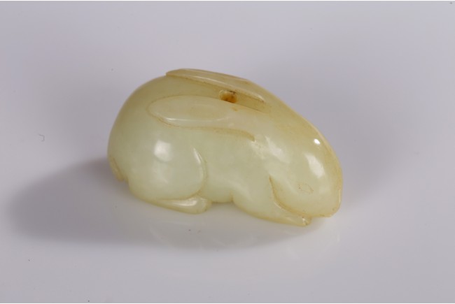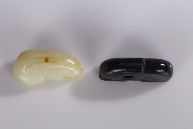 Comprised of a recumbent white and black jade rabbit, each pierced with hole for suspending.