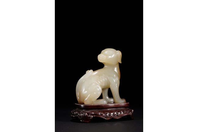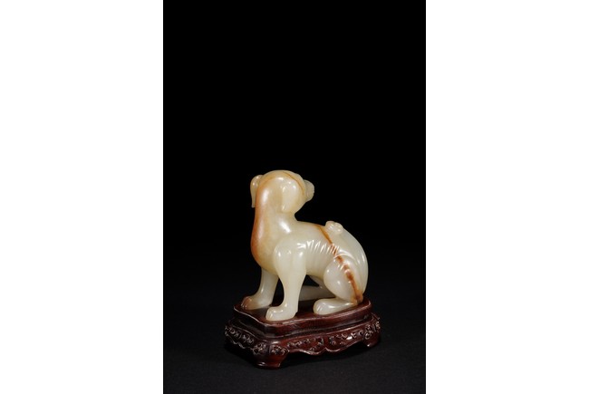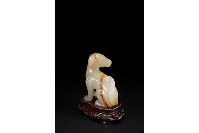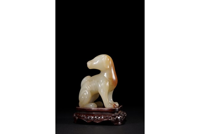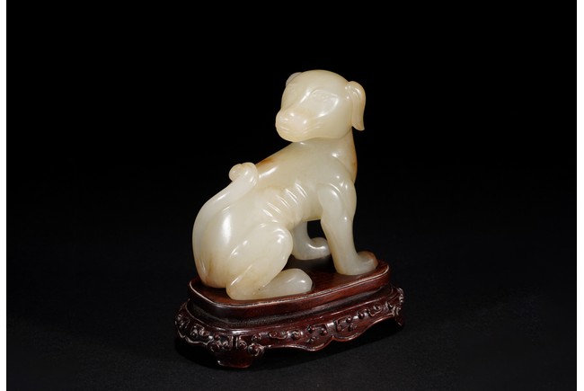 Carved in the form of a dog seated on its haunches, its head turned sharply to the back, the stone is of even white tone with russet skin, hardwood stand.