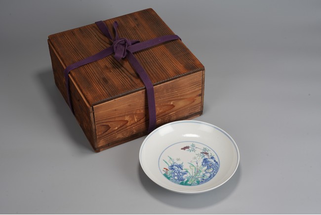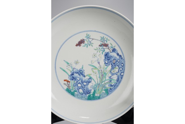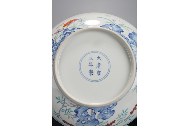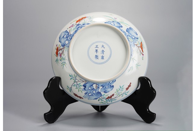 This finely potted dish features shallow curved sides, a tapered foot, and intricate enamel painting. The interior showcases a central medallion with narcissus flowers amidst rocks, painted in vibrant colors. The exterior is adorned with blue rocks, lingzhi, bamboo, and nandina berries. The base bears a six-character mark on the base within a double circle. Possibly Qing Dynasty Yongzheng period.